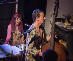 Le contrebassiste, chanteur et performer Fantazio trimbale sa pomme de crooner indélébile depuis une vingtaine d'années aux quatres coins des musiques hors-norme. Tour à tour oneman band furieux, improvisateur agité, compositeur méticuleux, agitateur populaire, poète et acteur solitaire, jazzman bordelique, ses collaborations rempliraient un carnet de note, de Benjamin Collin à Charles Pennequin en passant par Katherina Ex. Responsable de quelques disques aussi rares qu'indispensables, on le retrouve régulièrement aux côtés de la batteuse percussioniste japonaise Emiko Ota avec qui il partage volontier le goût de l'aventure. Originaire d'Osaka et active depuis les années 80, au Japon d'abord et en France ensuite, Emiko Ota a partagé de nombreuses scènes (avec Mami Chan, Urban Sax, Andrew Sharpley....) traversant le punk, le freerock, le jazz, la musique contemporaine et traditionnelle avec une grande insouciance. Auprès de Fantazio, elle fait corps à l'unisson et on a plutôt l'impression d'un objet musical à deux têtes plutôt que d'un "duo".