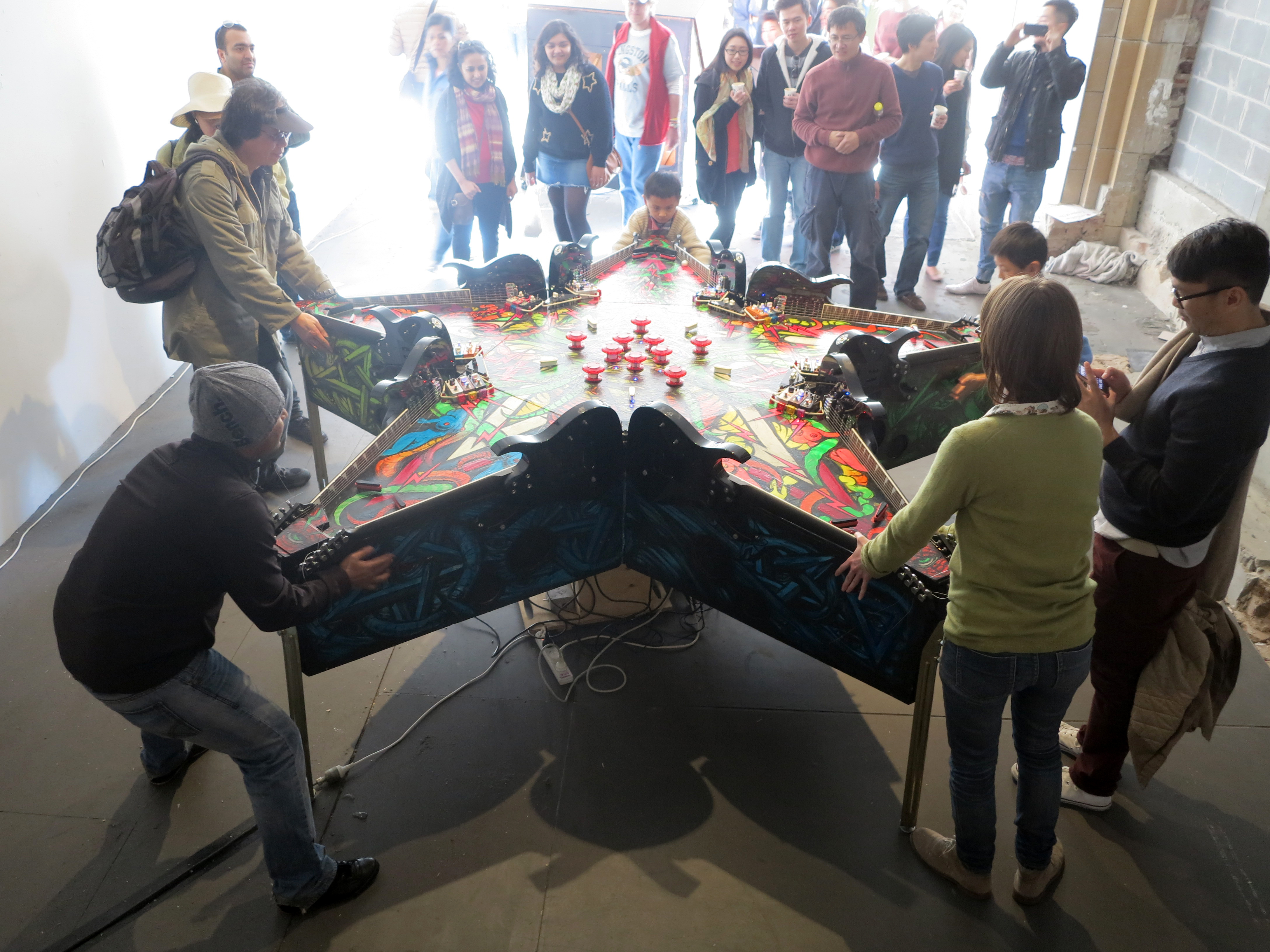 Pinball Pianola combinant un piano droit et un jeu de flipper avec vingt palmes, déclenchées par un clavier qui tire des balles contre les cordes exposées de la table d’harmonie. Balls for Cthulhu un flipper en pentagramme multi-joueur formé par dix guitares tournées vers l’intérieur, de sorte que les cordes