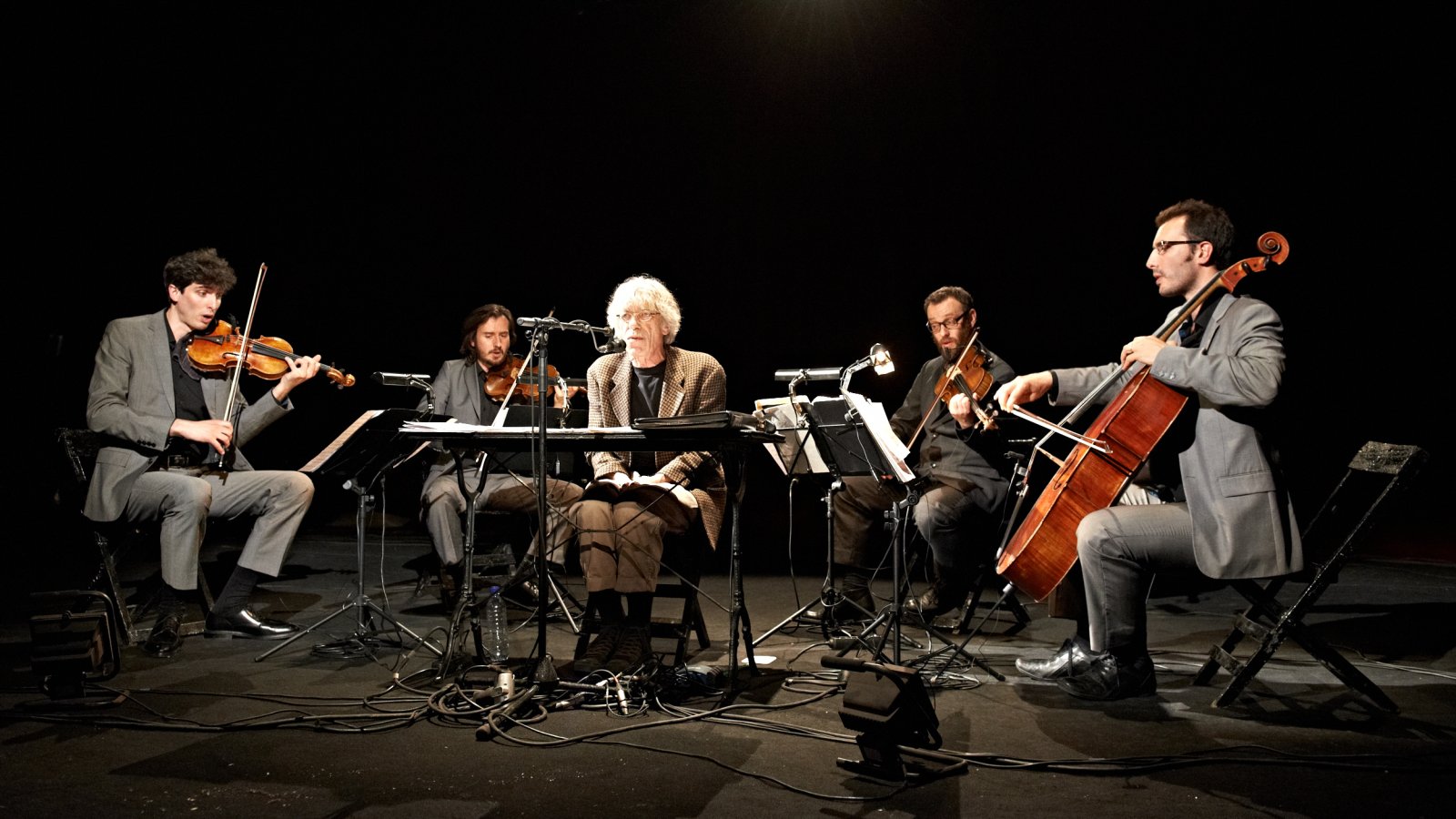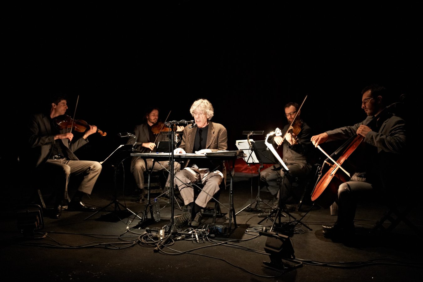 Albert Marcoeur est un insatiable défricheur des musiques de traverse. Depuis son premier disque en 1974, il n'a cessé d'expérimenter avec le format pop côté chanson française. Déstructurée, bidouillée, orchestrée, polyrythmée et déglinguée sont les adjectifs propres à décrire une chanson de Marcoeur, sans jamais oublier deux ingrédients essentiels : un sens de l'humour déconcertant et une élégance toute personnelle. Hors normes, hors-pistes et surtout hors des circuits commerciaux puisqu'il s'est exilé du système économique classique pour s'autoproduire totalement. Le Quatuor Béla est formé par quatre musiciens qui ont en commun l'excellence et la curiosité, capables de faire le grand écart, si rare de nos jours, entre musique contemporaine exigeante (Ligeti ou Bartok) et musique plus populaire de qualité. En témoigne cette rencontre avec Albert Marcoeur à l'occasion de l'enregistrement de la musique du film de Jean-Pierre Darroussin, Le Pressentiment. Cette collaboration se poursuit avec l'album "Travaux pratiques" (le 10ème du poète zappaiste !) sur lequel la maturité et la technique de ces musiciens classiques de haut niveau ainsi que leur ouverture d'esprit se marient à merveille avec l'univers si particulier de Marcoeur. Avec "Si oui, oui. Sinon non !" le public est plus proche d'un spectacle minimal branlant que du concert traditionnel rébarbatif : quatre instruments à cordes, quatre choristes, une voix qui chante l'absurdité du quotidien, une petite table percussive en bois et une bonne dose de poésie jubilatoire. Quelques pistes thématiques qui pourraient être abordées lors de ce nouveau spectacle : les produits d'entretien, l'éclipse, les cogitations du tubiste de l'Orchestre d'Harmonie de Venarey-lès-Laumes, les chemins de l'école, les mouches...