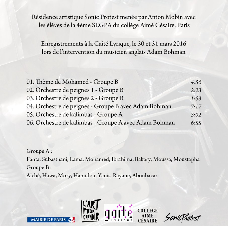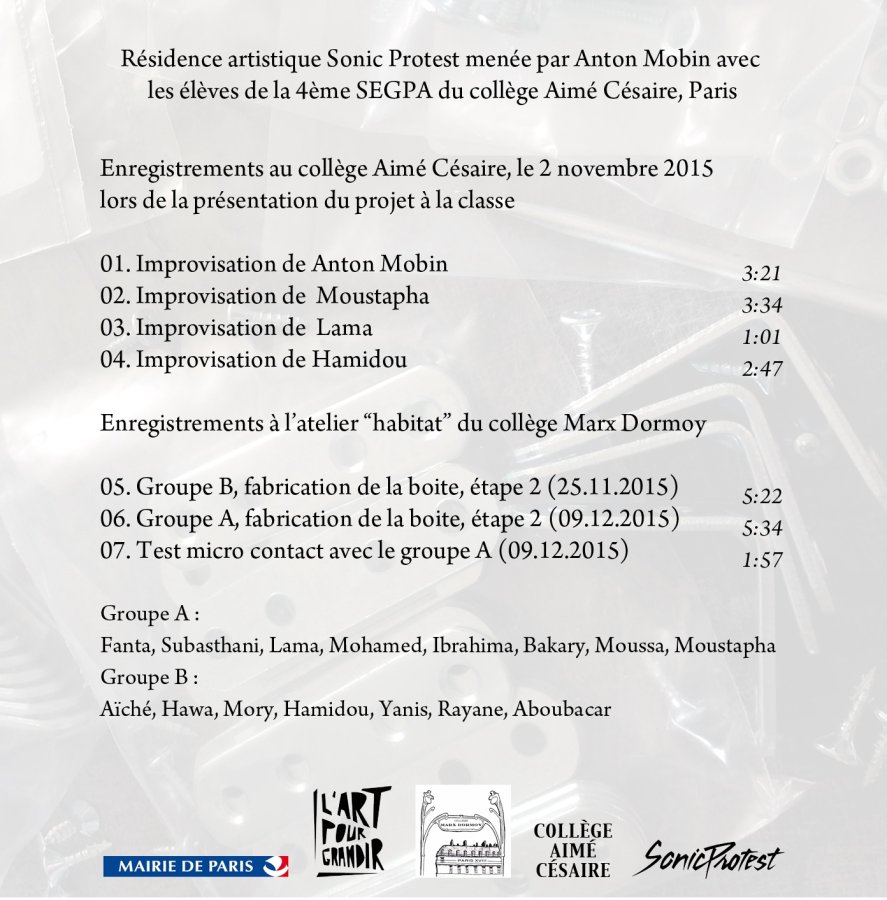 Projet mené avec le Festival Sonic Protest et les artistes Anton Mobin (référent) et Adam Bohman (invité) avec la complicité de Mr Terrana (principal du collège), Mme Choux (directrice chargée de la SEGPA),