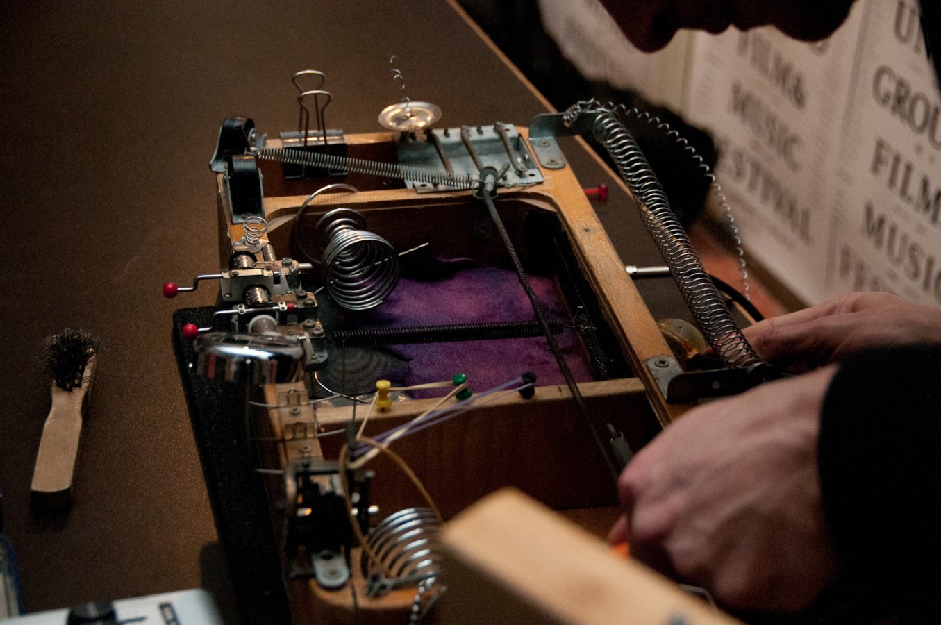 Improvisateur et producteur radio spécialisé dans l’art sonore, Anton Mobin est un adepte de la lutherie expérimentale bien connu de l’underground parisien. Depuis une dizaine d’années il construit ses propres instruments, qu’il nomme “Chambres Préparées” ou “Boîtes à Sons “ et dans lesquelles est agencée une multi- tude d’objets amplifiés par des micro- phones. Au fil du temps et des rencontres, il a développé ses propres techniques de jeu dans une approche intuitive, personnelle et dynamique.