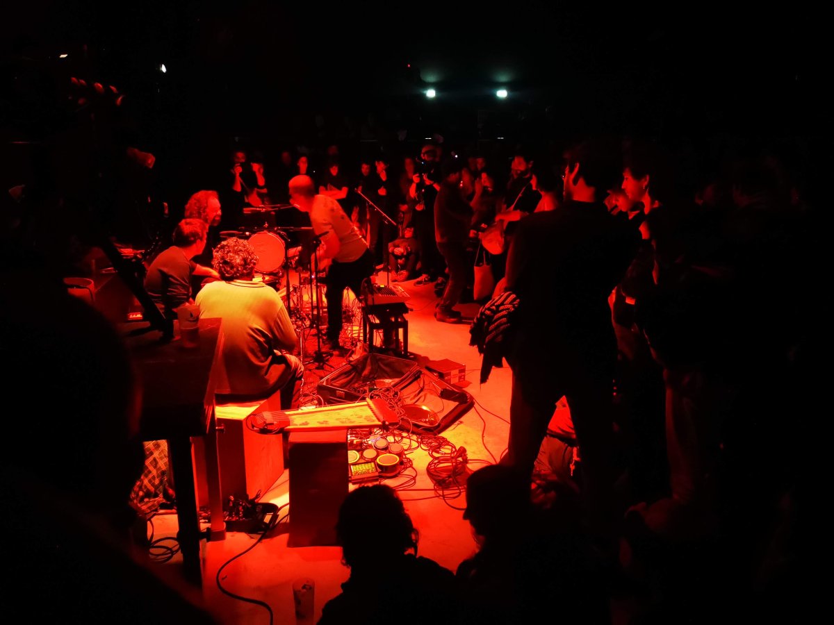 En s’autorisant ce geste pour les sans-folklores, cette panique chantée où les rumeurs de musiques anciennes ou lointaines sont volontairement brouillées par des airs de chanson française, italienne et arabe, le désormais quintet s’offre la même liberté de transgression avec l’idée même de concert : sans début ni fin, le temps du spectacle et le temps quotidien se confondent afin de vider délibérément de toute autonomie la temporalité de la performance.