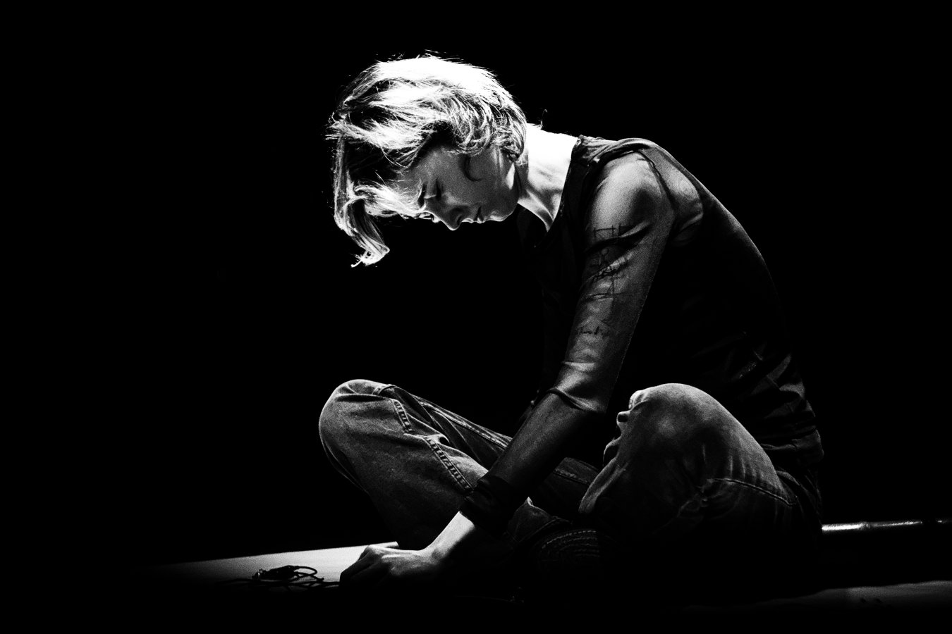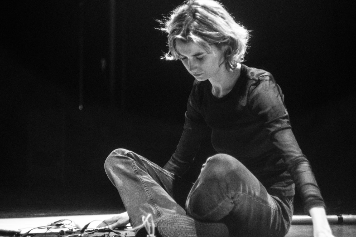 En live, Céleste Gatier assemble des composants électroniques et crée peu à peu un instrument, réduit, brut, en constante mutation.