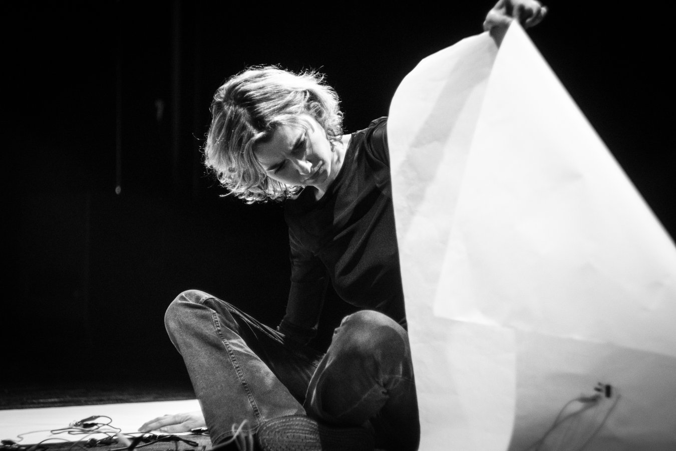 Chaque étape de cette construction in vivo est aussi sonore que visuelle et chaque infime geste génère des nouveaux phénomènes sonores, instables et imprévisibles, au gré des coupures, des interférences, des courts-circuits. Aux crépitements de bruits blancs s’ajoutent des voix, dans une dialectique étrange entre la froideur des fréquences blanches et des mots poèmes.