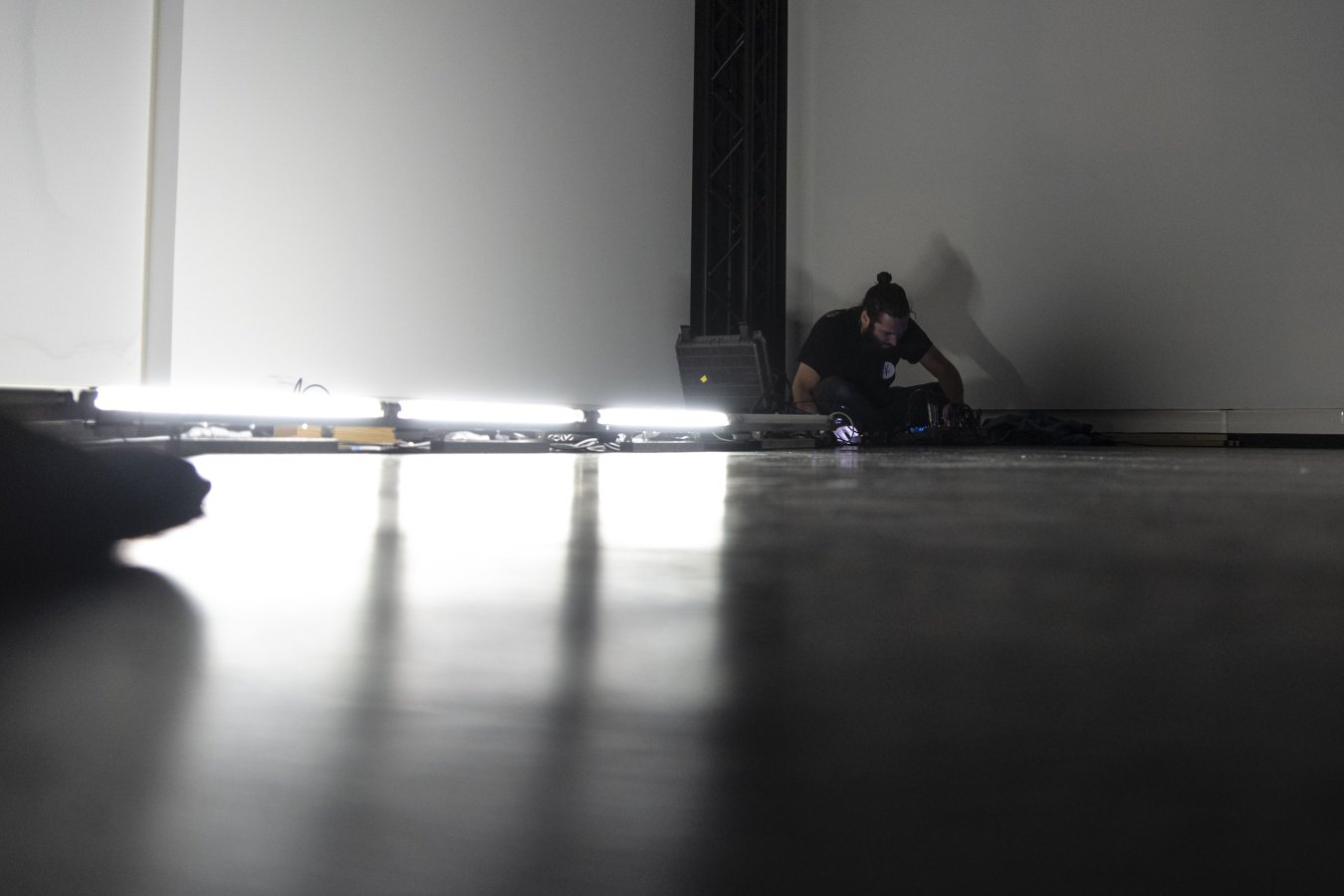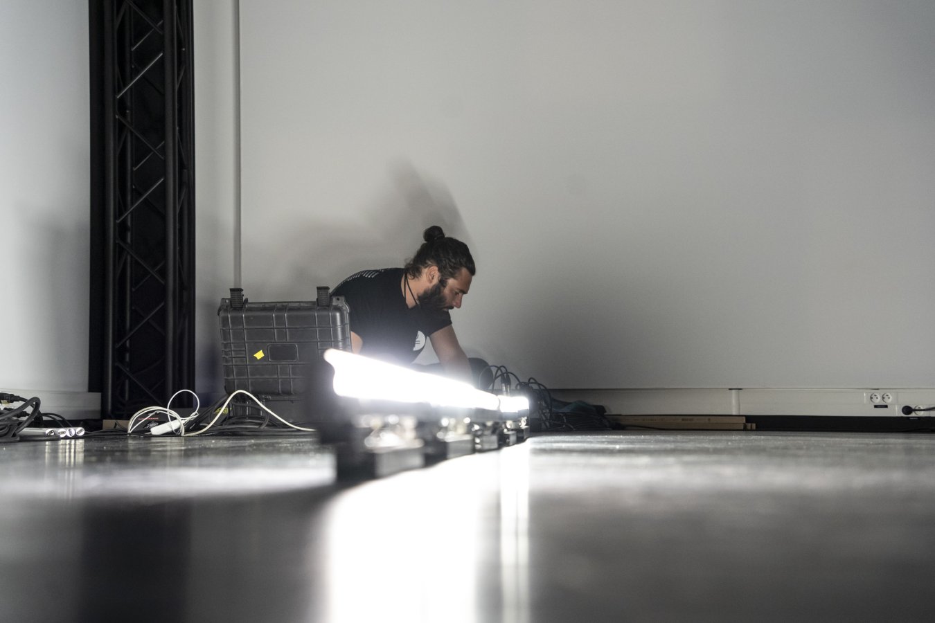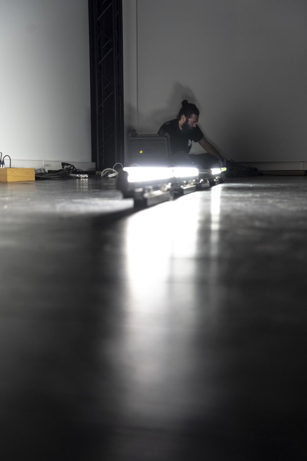 Chacun des interrupteurs des tubes fluorescents est actionné indépendamment grâce à une carte électronique connectée à un ordinateur. Ainsi par le biais d’algorithmes produisant des séquences d’allumage, ces décharges deviennent des processus rythmiques audibles contrôlés en direct.