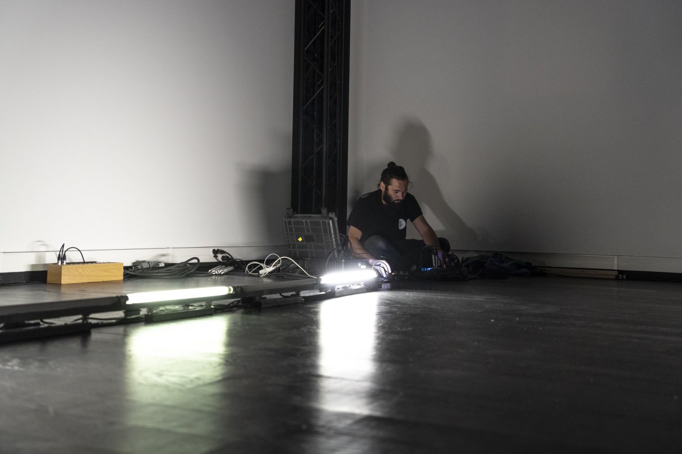 La performance consiste à explorer le potentiel sonore d’un réseau électrique. Pour cela des micros captant les champs électromagnétiques rendent audible les décharges d’allumages de tubes fluorescents (néons).