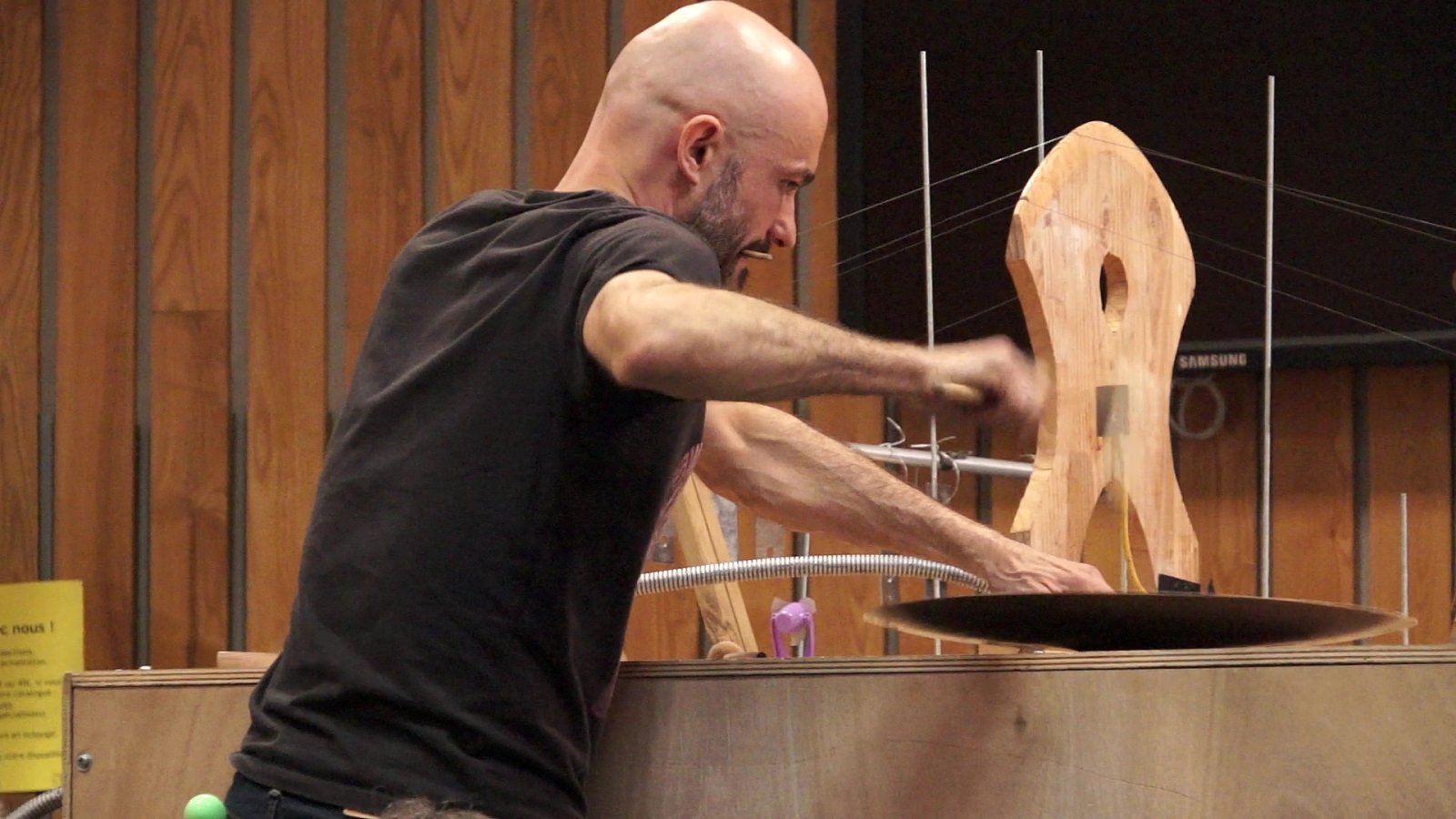 il réalise avec les jeunes et leurs éducateurs un parcours sonore pour le parc de l’établissement. Pour le vernissage de l’exposition il fera une petite présentation “live” et amplifiée de son instrument.