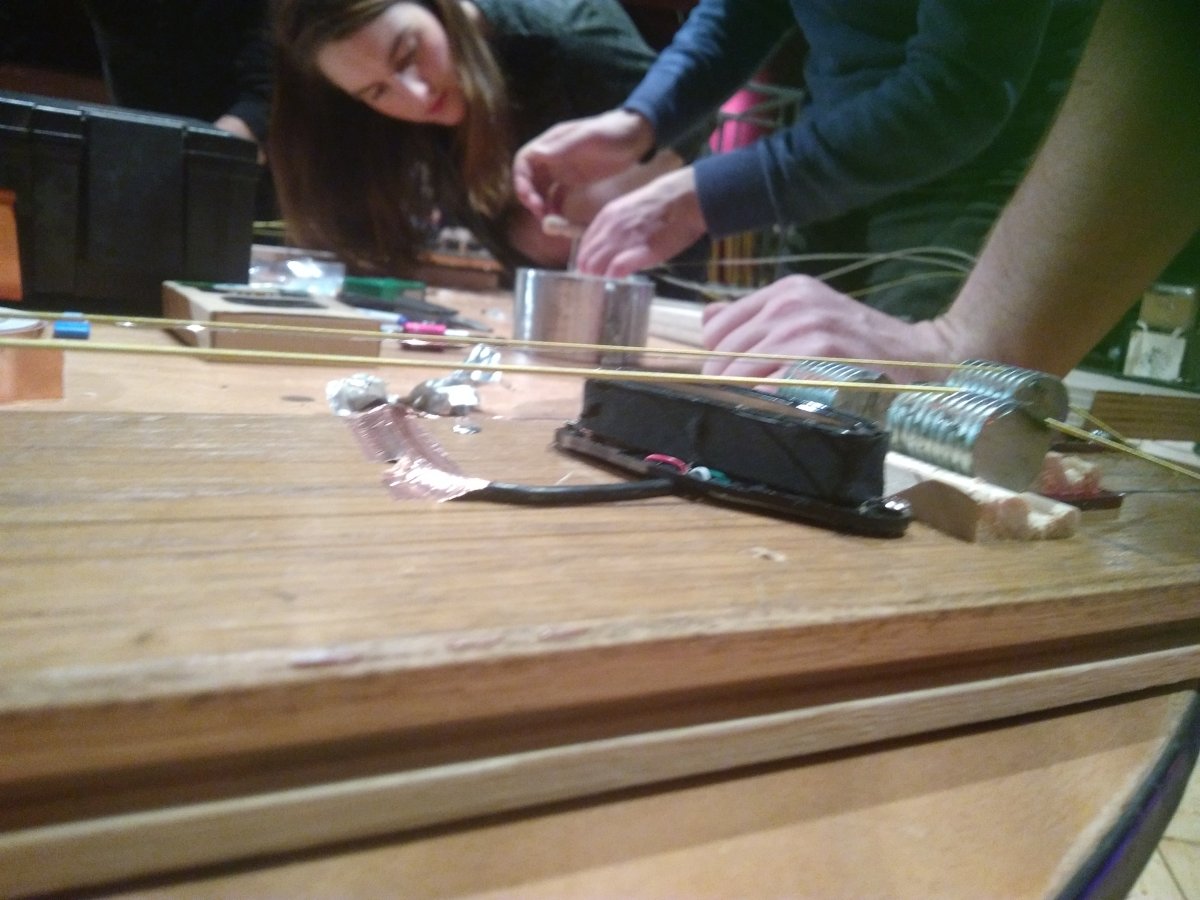 L’idée est de fabriquer en une matinée une guitare « faite maison » inspirée des « lapsteel guitar » afin de développer des pistes possibles pour la mise en place d’ateliers de Pratiques Brutes de la Musique.