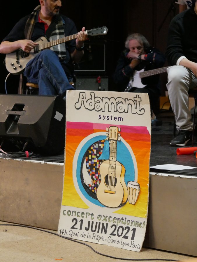 L'Adamant est un bâtiment flottant, sur la Seine. C'est un hôpital de jour qui accueille des personnes vivant dans le centre de Paris. C'est aussi un club thérapeutique, L'Embarcadère, son bar associatif. Un journal apériodique (et oui), Les Beaux Barres, une webradio (laoueve.com), un groupe "musiques" avec des instruments, des grosses enceintes, une énorme table de mixage, et des voix, une médiathèque, des péniches qui passent, des riffs de guitare en boucle, des oiseaux, des sirènes, du cinéma, des machines à coudre, des oreilles qui écoutent et Tant de Poses. Et tant d'autres choses.