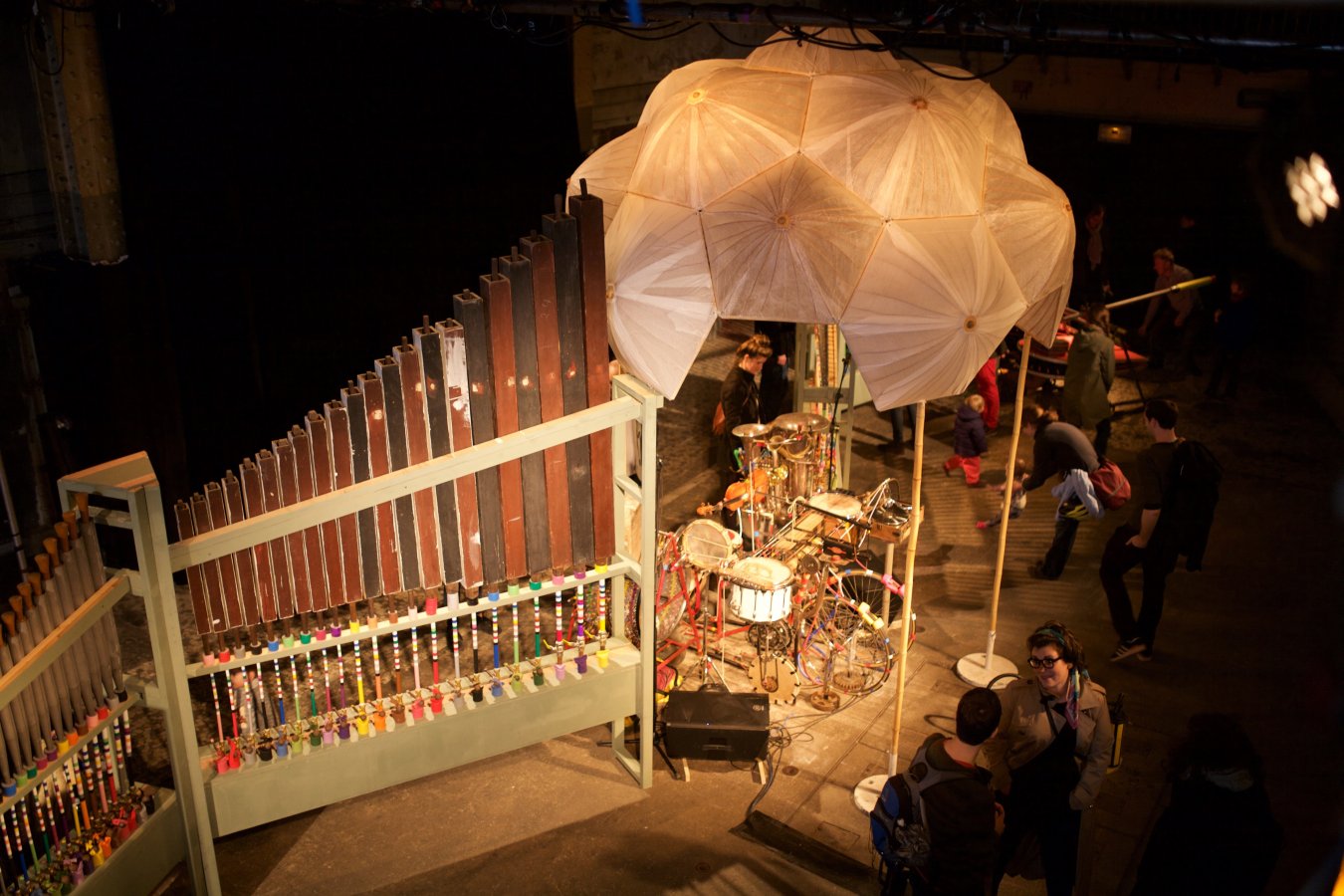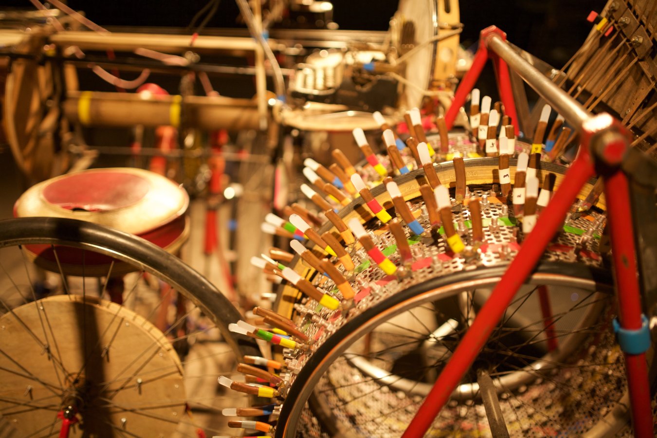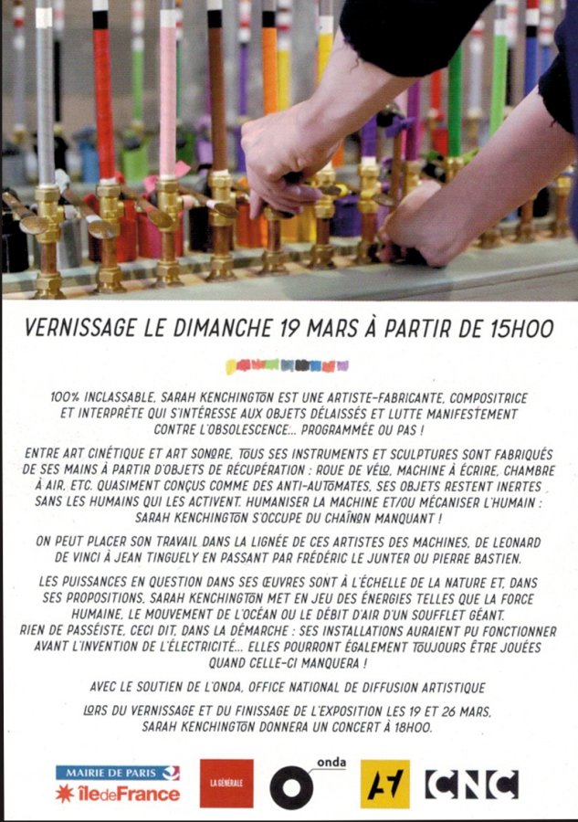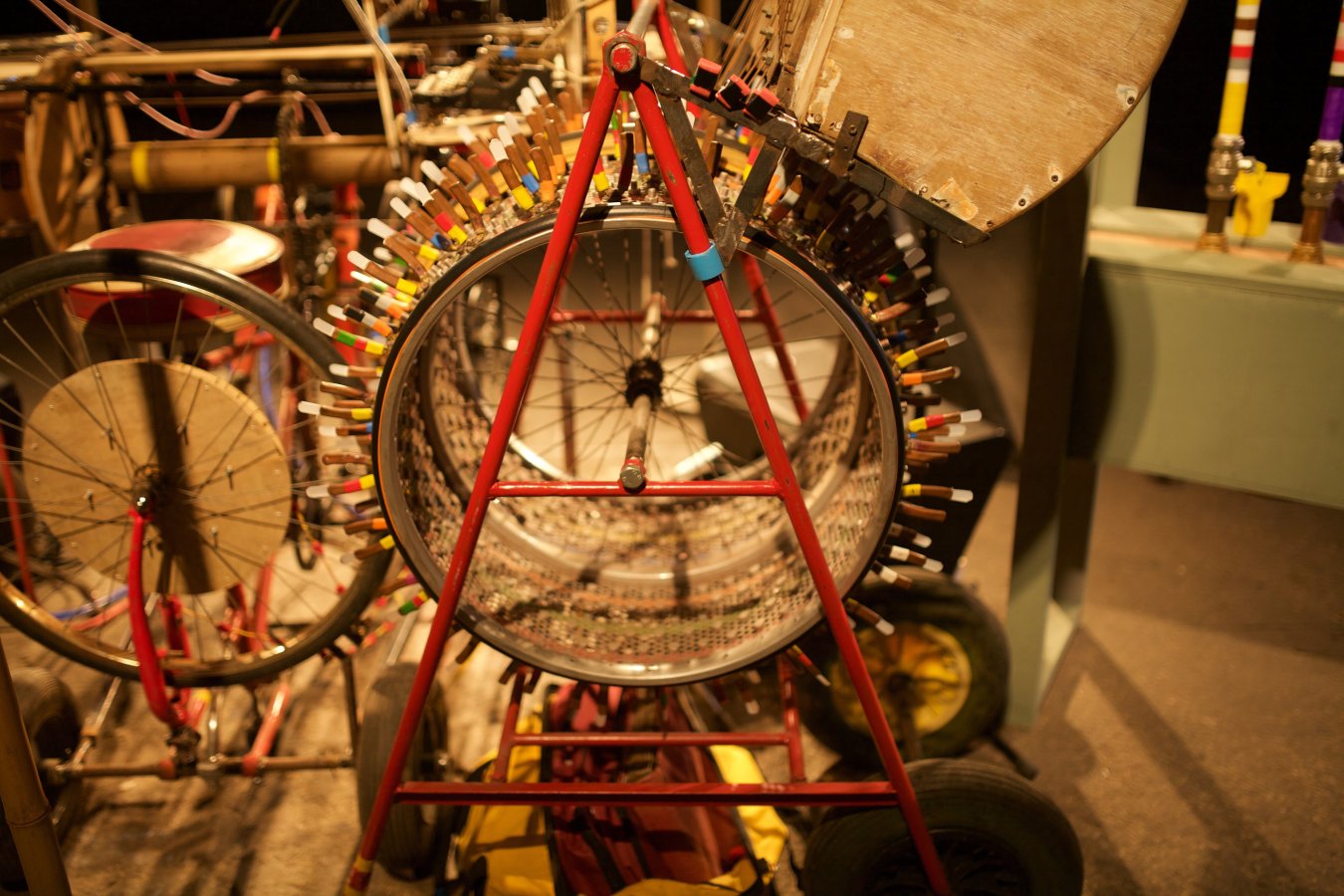 Entre art cinétique et art sonore, tous ses instruments et sculptures sont fabriqués de ses mains à partir d’objets de récupération : roue de vélo, machine à écrire, chambre-à-air, etc. Conçus quasi comme des anti-automates, ses objets restent inertes sans les humains qui les activent. Humaniser la machine et/ou mécaniser l’humain : Sarah Kenchington s’occupe du chaînon manquant !