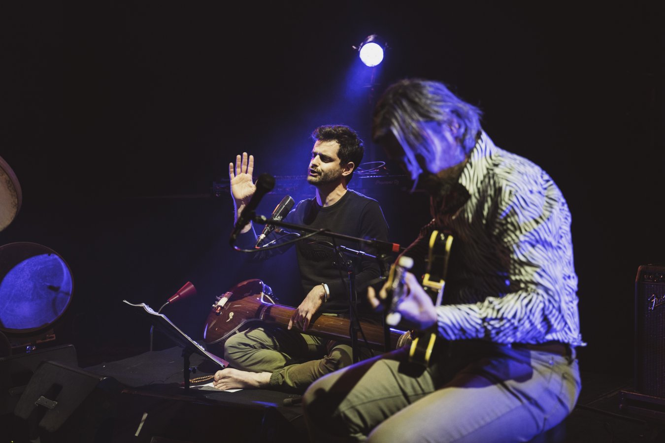 Ce Trio c’est Guilhem Lacroux, guitare électrique défrettée, Thomas Lippens, percussions sur cadre et Clément Gauthier chant, saz, tanpura, porteur du projet. C’est le Trio SERR.