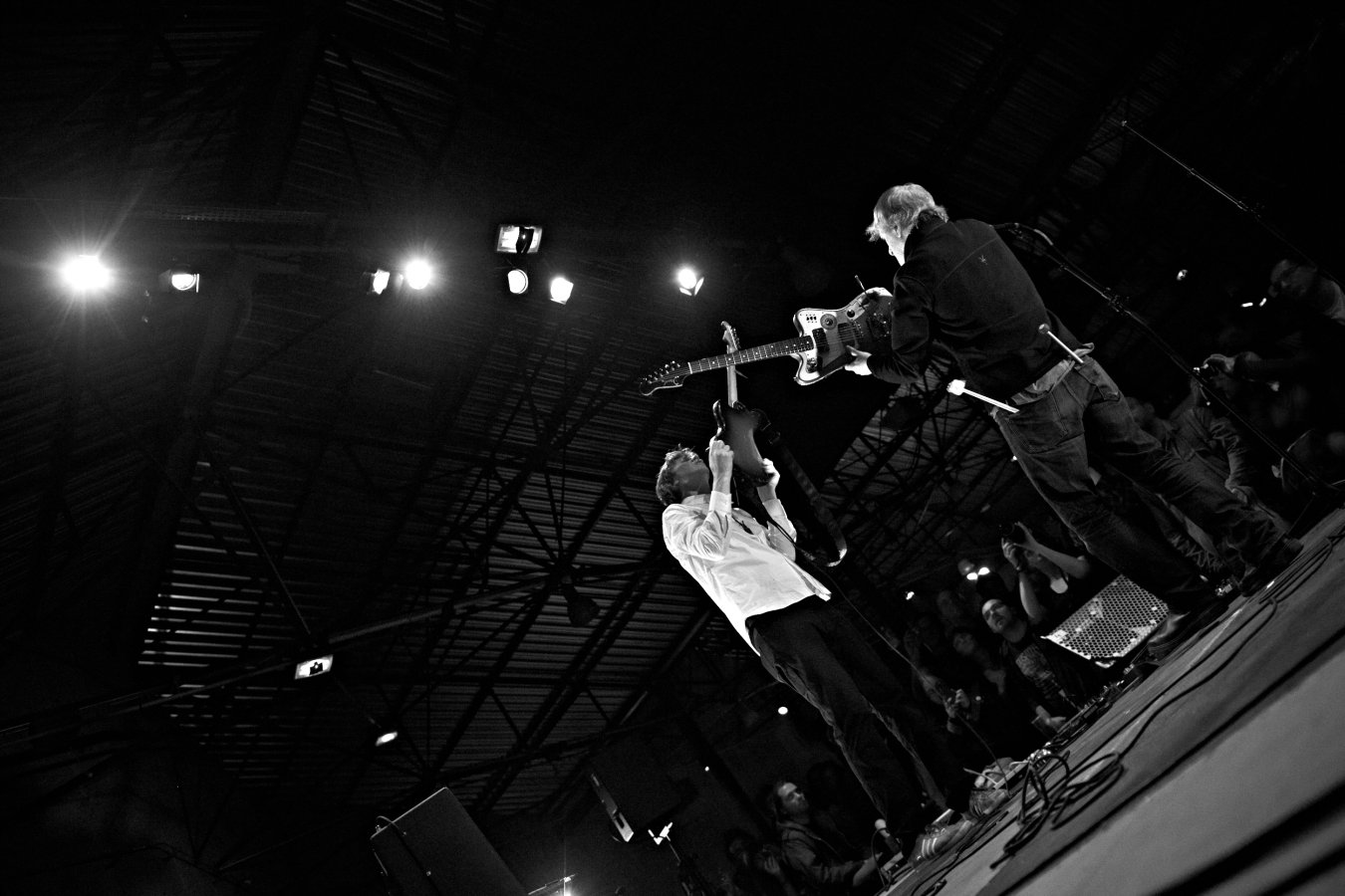 Lee Ranaldo et Thurston Moore à Sonic Protest ! Soit deux des plus aventureux activistes des musiques d'aujourd'hui, de ceux qui créent un style, qui font les liens et suscitent des vocations. Tous deux fondateurs de Sonic Youth, ces têtes chercheuses se sont rencontrées dans l'orchestre de Glenn Branca en pleine explosion No Wave et ont influencé plus d'un auditeur en détruisant méticuleusement la frontière entre pop music et avant-garde. A travers le parcours de Sonic Youth ou de nombre de leurs projets annexes (Chelsea Light Moving ou Text Of Light) et au sein de leurs innombrables collaborations avec des artistes aussi divers et cultes que Christian Marclay, William Hooker, Alan Licht, Truus de Groot, etc. (pour Ranaldo) ou Borbetomagus, Merce Cunningham, Gus Van Sant (pour Moore), leur influence sur la scène internationale des musiques obliques est majeure. Lee Ranaldo et Thurtson Moore sont deux passeurs de musique : par delà les genres, ils montrent que la musique parle d'elle-même. Revendiquant la liberté comme moteur de la création, Moore et Ranaldo n'hésitent pas à faire le grand écart entre chanson et musique contemporaine : ils forment un lien unique entre la structure couplet / refrain et l'improvisation la plus radicale, le réductionnisme et l'attentat sonore, le rock et la noise. De l'approche organique, cinématographique et quasi conceptuelle de Ranaldo à celle plus déglinguée et brutaliste de Moore, la volonté commune reste toujours de tisser des ponts, décloisonner et surtout expérimenter ! Du bruit et de la poésie, de la fureur et de la délicatesse, ensemble ou séparément, Lee Ranaldo et Thurston Moore osent tous les rapprochements depuis près de trente-cinq ans : merci !