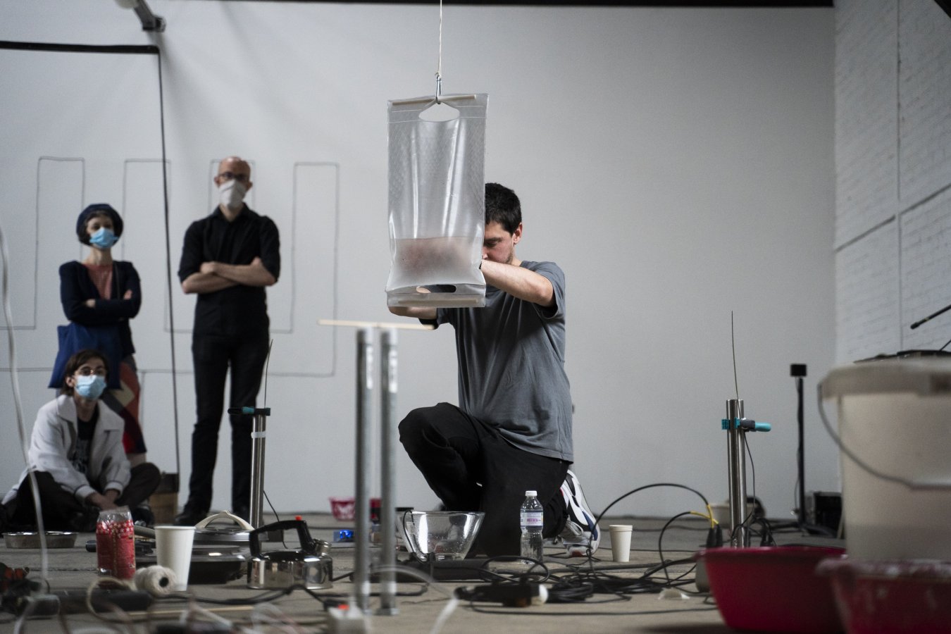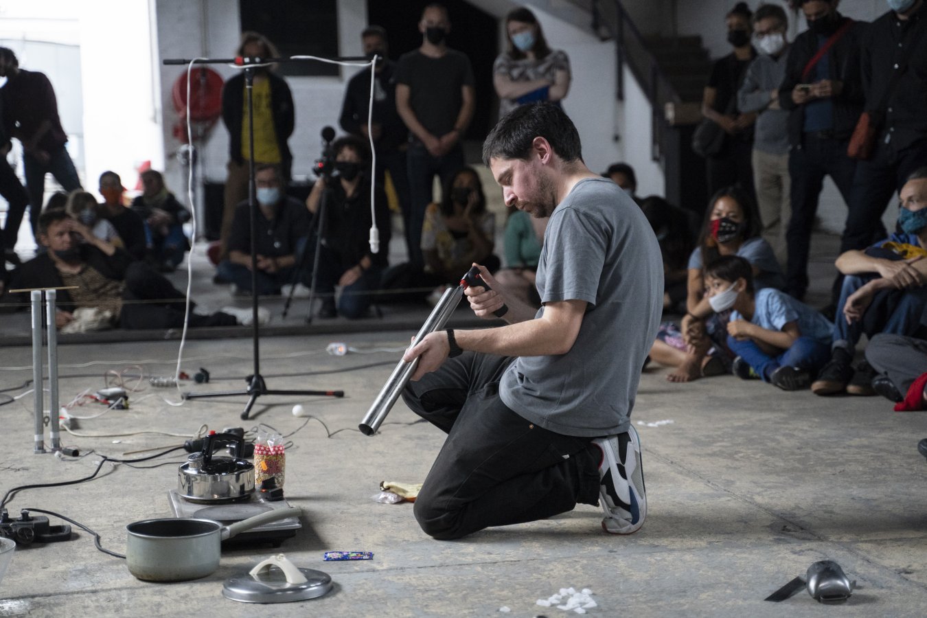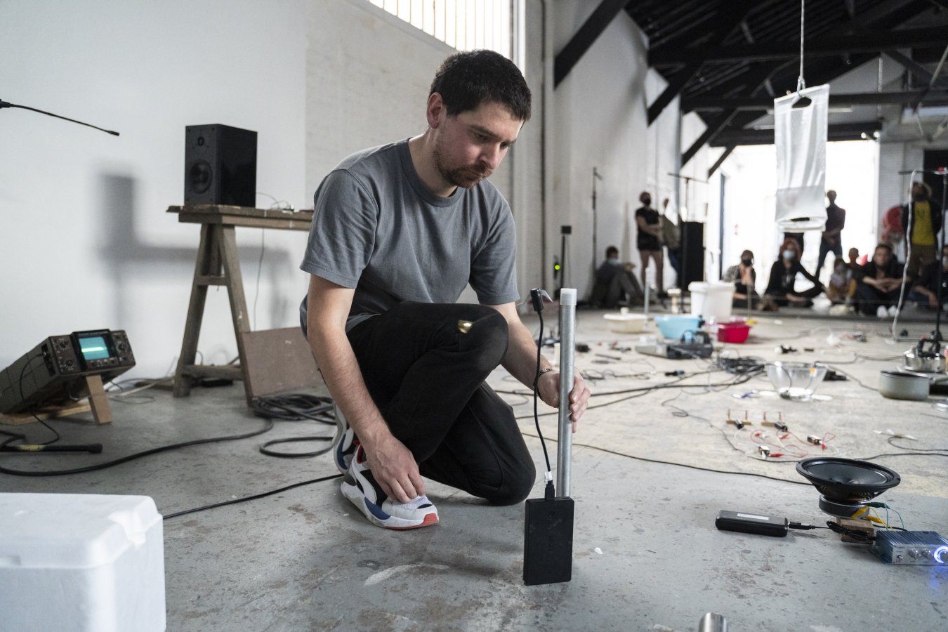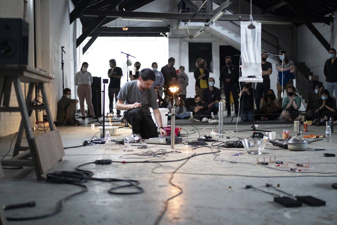 Dans Point of Failure, Tim Shaw, joue avec les caractéristiques acoustiques du lieu de performance au moyen de cônes de haut-parleur, d’ampoules, de pétards, de bobines tesla, de cornes à air, d’éclateurs, d’antennes paraboliques, de boules de fumée, de klaxons de voiture, de gouttes d’eau, d’hydrophones, de shaker, de cloches, de synthétiseurs modulaires, d’instruments à cordes faits maison, de ballons, de transducteurs, de pluie, de ventilateurs, de solénoïdes, de micros contact, de circuits bricolés et de moteurs. En fabriquant et en défaisant des objets, en construisant des mécanismes hybrides pour faire du bruit, en déployant une expérience multisensorielle désordonnée, se crée un environnement hypnotique dans lequel le son, la lumière, la fumée, l’odeur et le mouvement s’entremêlent.