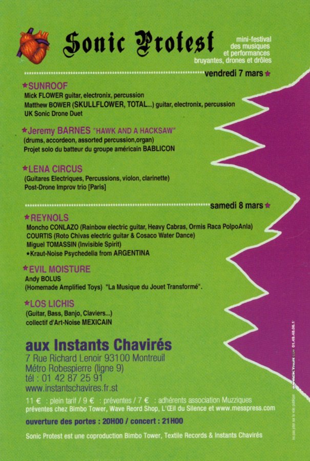 Pas du tout destinée à se reproduire pendant des dizaines d’années, la première édition de Sonic Protest était quasi une manifestation spontanée. À l’annonce de la première (et unique !) venue des Reynols en Europe, la triplette Arnaud Rivière (à l’époque aux Instants Chavirés), Franq de Quengo (à l’époque à Bimbo Tower) et Benoît Sonnette (à l’époque à Textile Records) se réunit au café et décide, après quelques verres, de créer Sonic Protest, un peu pour rigoler (beaucoup), un peu pour créer sa propre géographie des sons.