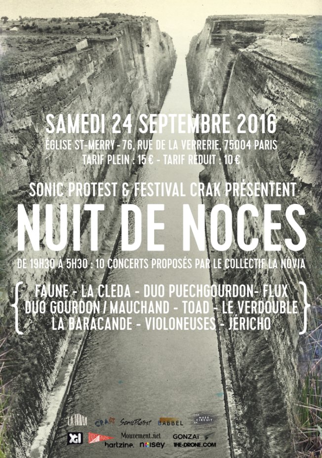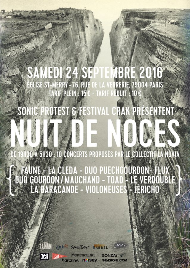 Depuis 2010, déjà, Sonic Protest présente des artistes issus de ce collectif à Paris (Yann Gourdon en solo, Trio Puech Gourdon Brémaud ou Jéricho) et profite de la complicité avec l'équipe organisatrice du Festival Crak pour présenter cet événement exceptionnel en conclusion de cette 5ème édition du-dit festival : 9 concerts qui en appellent autant à l'écoute qu'à la danse, une nuit blanche aux accents d'Oc en plein cœur de Paris, dans le cadre unique de l'église St-Merry reconvertie pour l'occasion en dance-floor … en mode trad’.