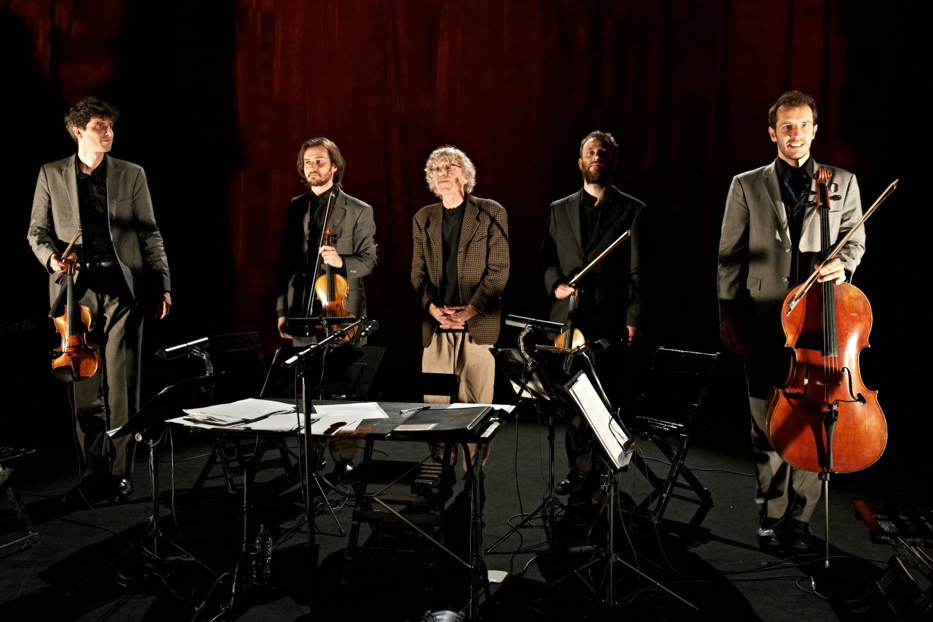 Albert Marcoeur est un insatiable défricheur des musiques de traverse. Depuis son premier disque en 1974, il n'a cessé d'expérimenter avec le format pop côté chanson française. Déstructurée, bidouillée, orchestrée, polyrythmée et déglinguée sont les adjectifs propres à décrire une chanson de Marcoeur, sans jamais oublier deux ingrédients essentiels : un sens de l'humour déconcertant et une élégance toute personnelle. Hors normes, hors-pistes et surtout hors des circuits commerciaux puisqu'il s'est exilé du système économique classique pour s'autoproduire totalement. Le Quatuor Béla est formé par quatre musiciens qui ont en commun l'excellence et la curiosité, capables de faire le grand écart, si rare de nos jours, entre musique contemporaine exigeante (Ligeti ou Bartok) et musique plus populaire de qualité. En témoigne cette rencontre avec Albert Marcoeur à l'occasion de l'enregistrement de la musique du film de Jean-Pierre Darroussin, Le Pressentiment. Cette collaboration se poursuit avec l'album "Travaux pratiques" (le 10ème du poète zappaiste !) sur lequel la maturité et la technique de ces musiciens classiques de haut niveau ainsi que leur ouverture d'esprit se marient à merveille avec l'univers si particulier de Marcoeur. Avec "Si oui, oui. Sinon non !" le public est plus proche d'un spectacle minimal branlant que du concert traditionnel rébarbatif : quatre instruments à cordes, quatre choristes, une voix qui chante l'absurdité du quotidien, une petite table percussive en bois et une bonne dose de poésie jubilatoire. Quelques pistes thématiques qui pourraient être abordées lors de ce nouveau spectacle : les produits d'entretien, l'éclipse, les cogitations du tubiste de l'Orchestre d'Harmonie de Venarey-lès-Laumes, les chemins de l'école, les mouches...