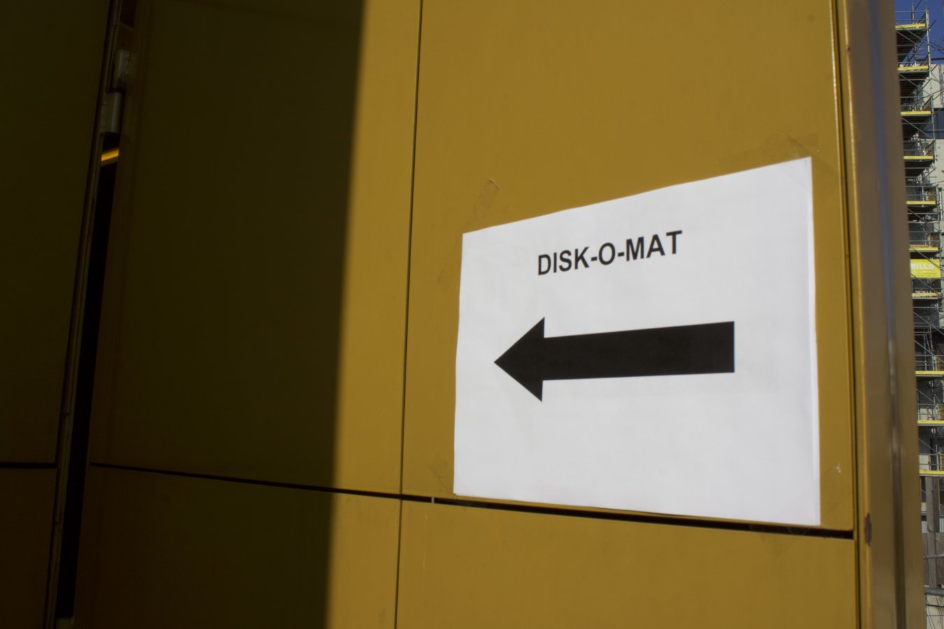 Dans le cadre de Sonic Protest, Flo Kaufmann présente un travail se situant aux confins de plusieurs médias, à mi-chemin entre l'art et le développement technique. À première vue, son disk-o-mat évoque un photomaton fait maison. Mais au lieu de produire des photos d'identité, la machine fabrique un autre objet : un disque vinyle unique. L'utilisateur glisse une pièce de 5 francs (suisses - vendue sur place !) dans l'automate. Le micro enregistre alors les sons produits pendant quelques minutes avant de les graver sur un disque, qui ressort par une fente pour que l'utilisateur puisse l'emporter. Une machine qui transforme tout un chacun en artiste.