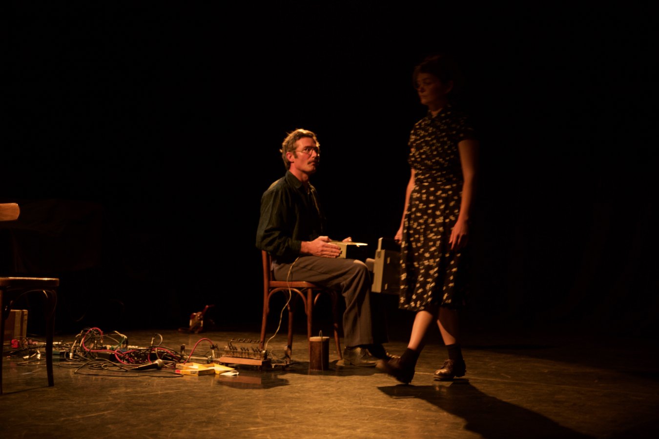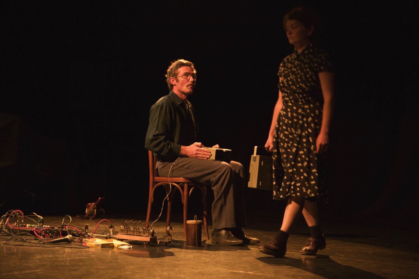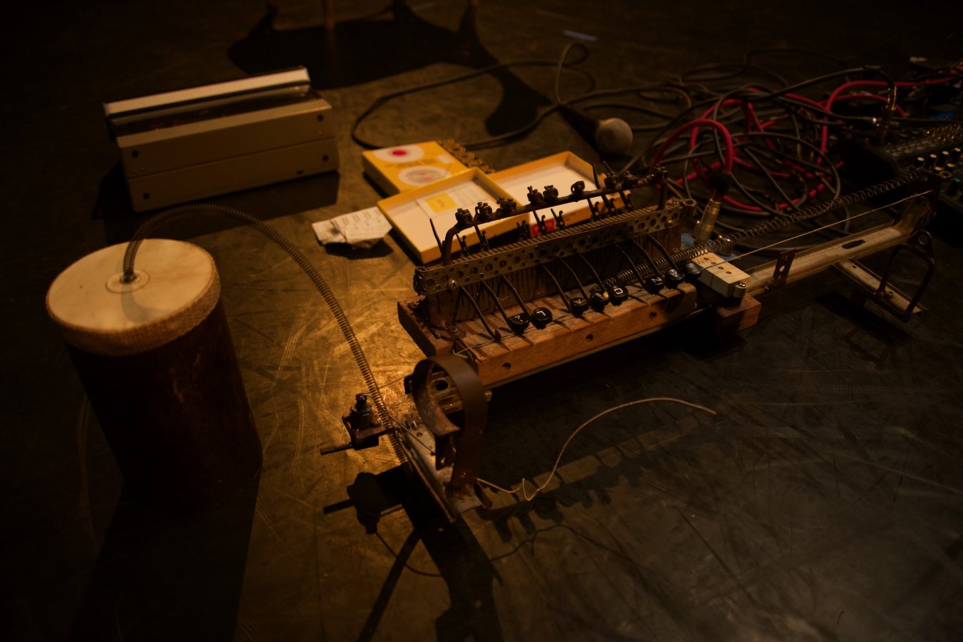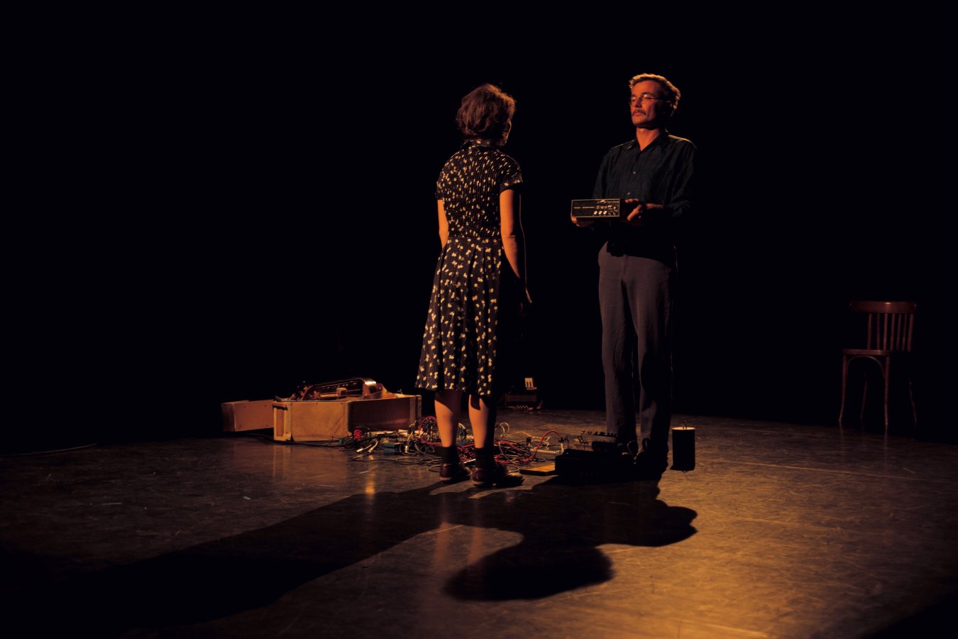 “La tristesse du facteur” par le duo Géométries est un mélange de diverses sources sonores spatialisées : Chant (le plus souvent a capella), lecteurs à bande sur piles (parfois en diffusion directe, parfois sonorisés pour plus de pression acoustique), incursions de vielle à roue, mini-accordéon et tapophone (instrument auto-construit, avec cordes basses et touches de machine à écrire).