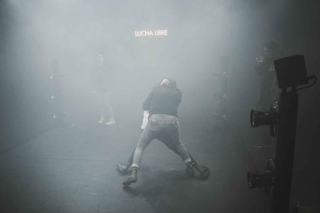 C’est cette atmosphère survoltée que réussit à traduire Méryll Ampe dans son installation Lucha Libre. Travaillant à partir de field recordings, l’artiste a enregistré in situ les sons de différents combats afin de les compiler dans une composition immersive. Deux cercles d’enceintes matérialisent l’espace du ring et celui de l’arène, créant une fascinante dynamique sonore. Cette matière est associée à une architecture de lumière qui reproduit la forme d’un ring, conçue avec l’artiste Jimmy Boury. Totalement immergé dans un espace sonore et physique, l’auditeur est amené à ressentir toute l’énergie et l’intensité d’un match. Une expérience sensorielle saisissante.