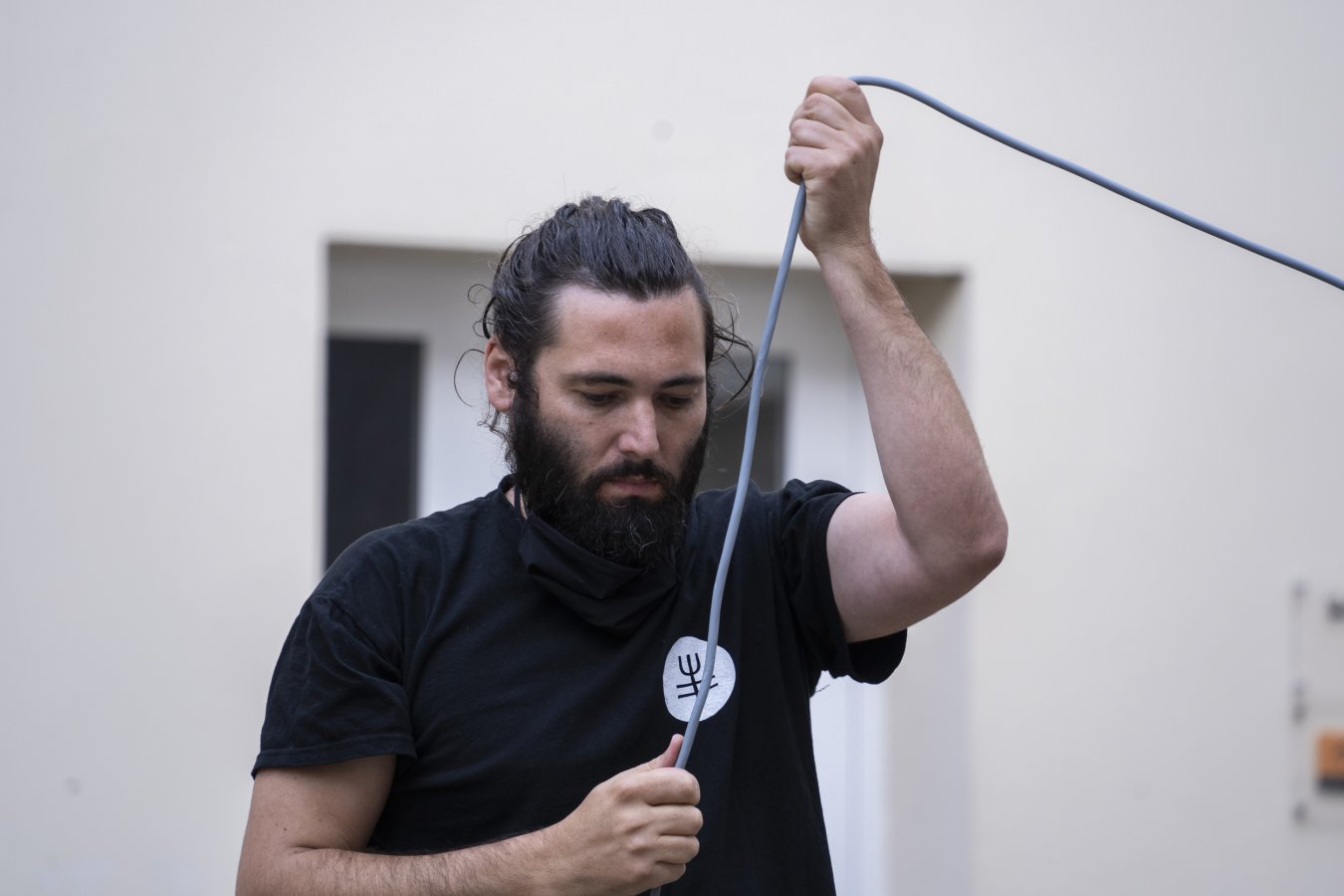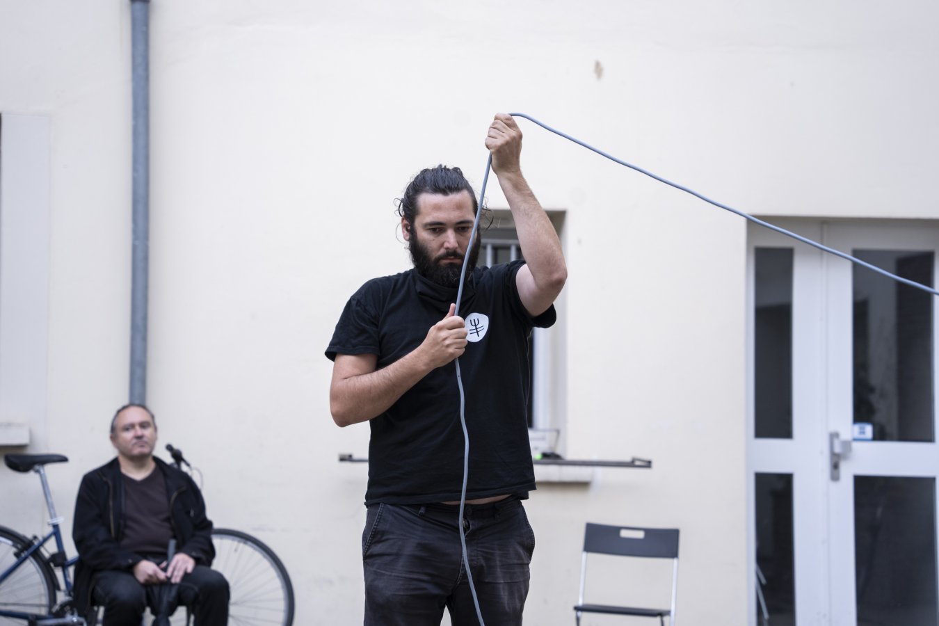 Samā‘ (du turc: semâ) est un mot qui renvoie à la notion d’audition spirituelle. Samā‘ désigne également une danse giratoire des derviches tourneurs soufis. Dans cette performance, Lucien Gaudion crée une spirale acoustique en faisant tournoyer un haut-parleur pour sculpter l’espace sonore. Les drones (sons continus) sont élaborés au préalable in situ, en fonction des résonances de la pièce. Le tournoiement, par la vitesse et la longueur de câble donnés par l’interprète dessine une spirale invisible tout en révélant les propriétés acoustiques du lieu.