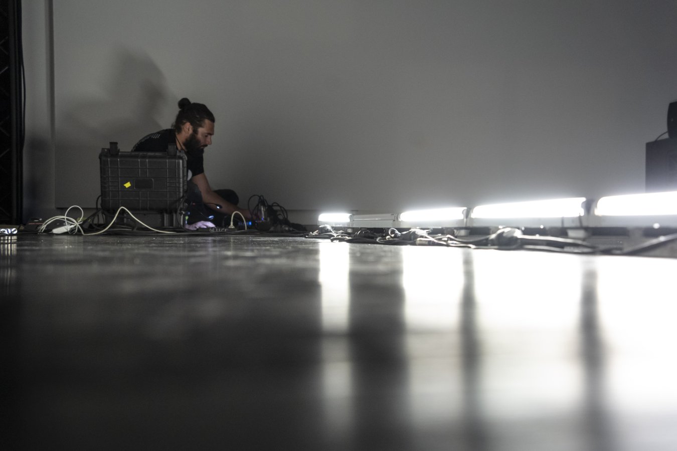 La performance consiste à explorer le potentiel sonore d’un réseau électrique. Pour cela des micros captant les champs électromagnétiques rendent audible les décharges d’allumages de tubes fluorescents (néons).