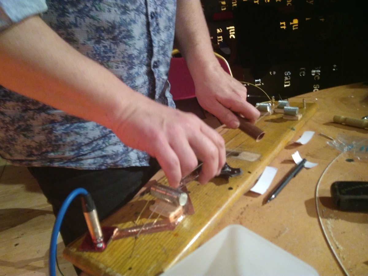 L’idée est de fabriquer en une matinée une guitare « faite maison » inspirée des « lapsteel guitar » afin de développer des pistes possibles pour la mise en place d’ateliers de Pratiques Brutes de la Musique.