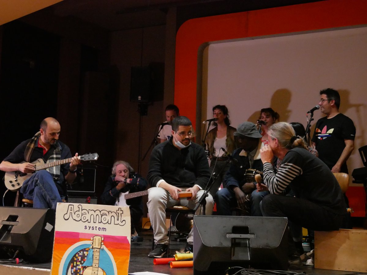 L'Adamant est un bâtiment flottant, sur la Seine. C'est un hôpital de jour qui accueille des personnes vivant dans le centre de Paris. C'est aussi un club thérapeutique, L'Embarcadère, son bar associatif. Un journal apériodique (et oui), Les Beaux Barres, une webradio (laoueve.com), un groupe "musiques" avec des instruments, des grosses enceintes, une énorme table de mixage, et des voix, une médiathèque, des péniches qui passent, des riffs de guitare en boucle, des oiseaux, des sirènes, du cinéma, des machines à coudre, des oreilles qui écoutent et Tant de Poses. Et tant d'autres choses.