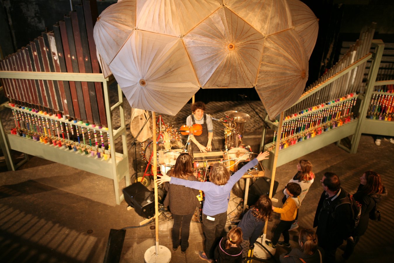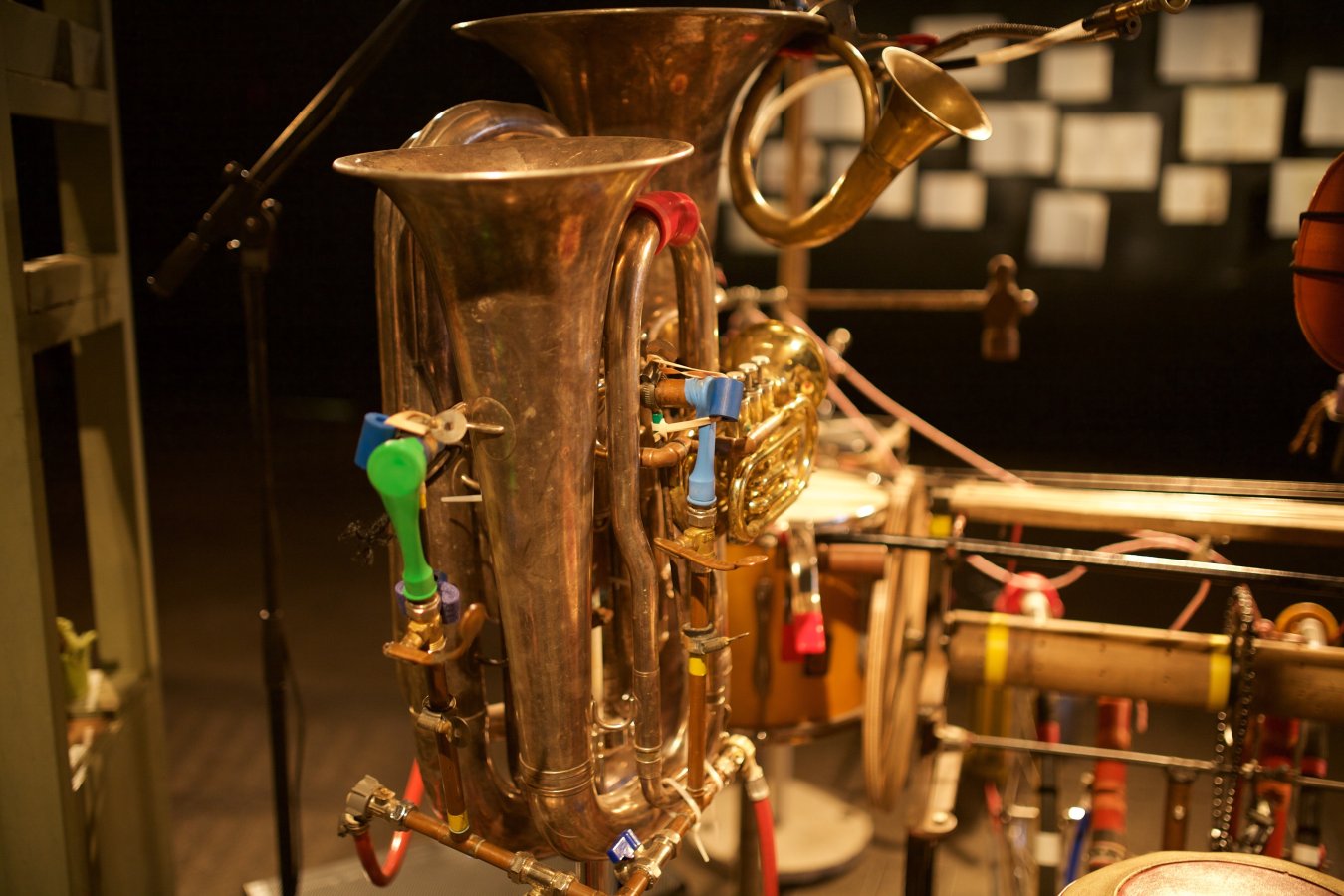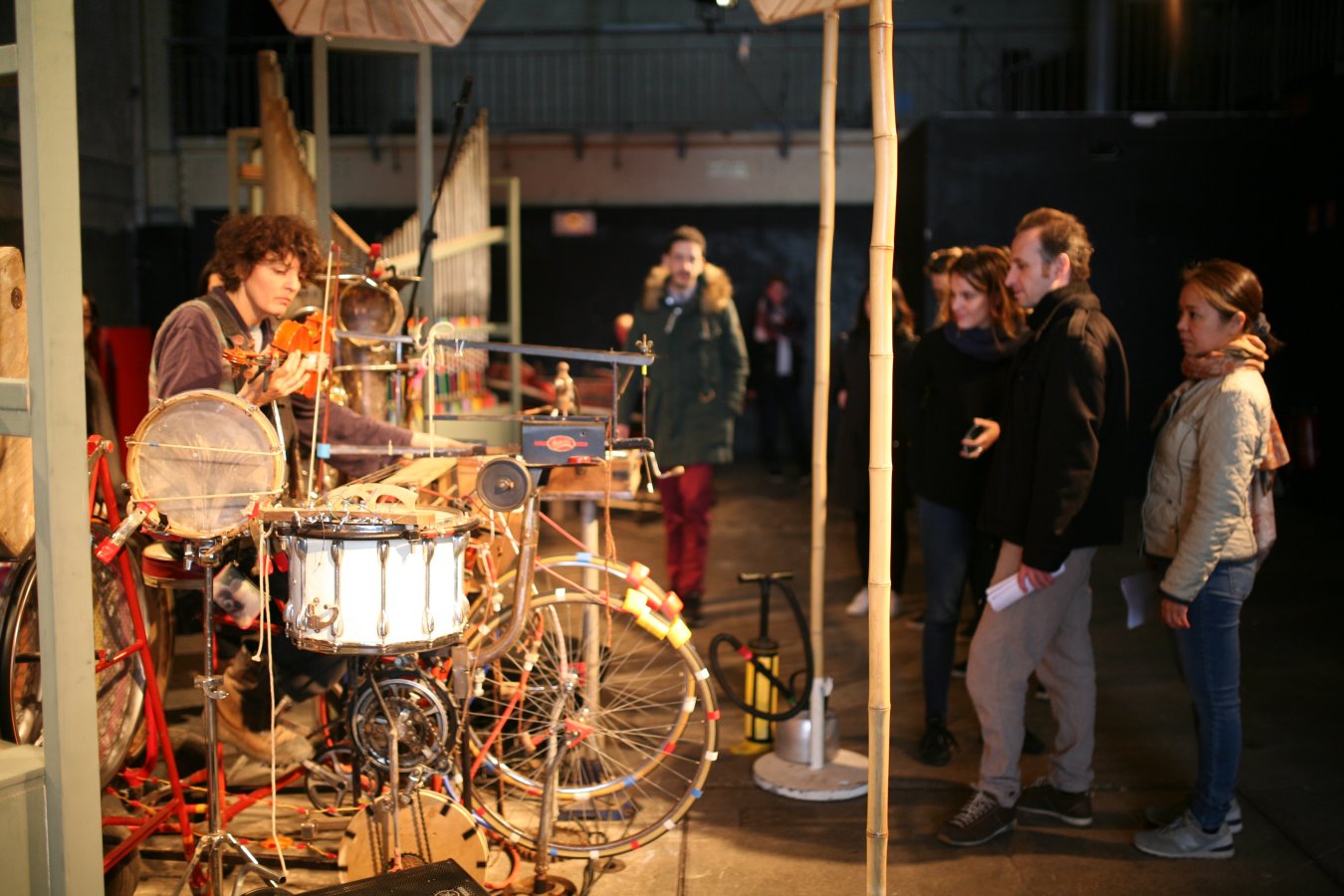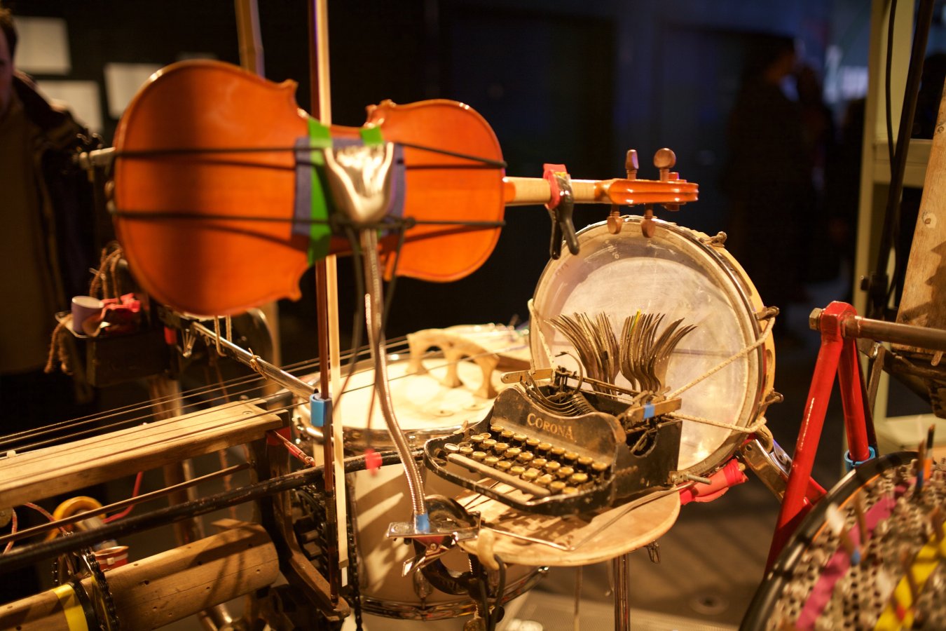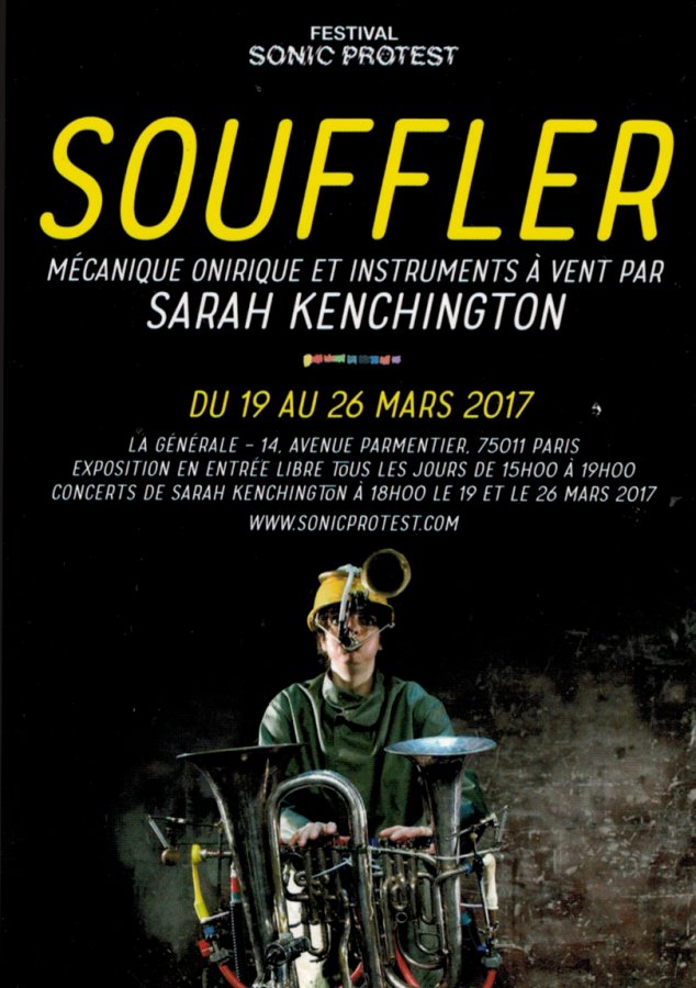 Entre art cinétique et art sonore, tous ses instruments et sculptures sont fabriqués de ses mains à partir d’objets de récupération : roue de vélo, machine à écrire, chambre-à-air, etc. Conçus quasi comme des anti-automates, ses objets restent inertes sans les humains qui les activent. Humaniser la machine et/ou mécaniser l’humain : Sarah Kenchington s’occupe du chaînon manquant !
