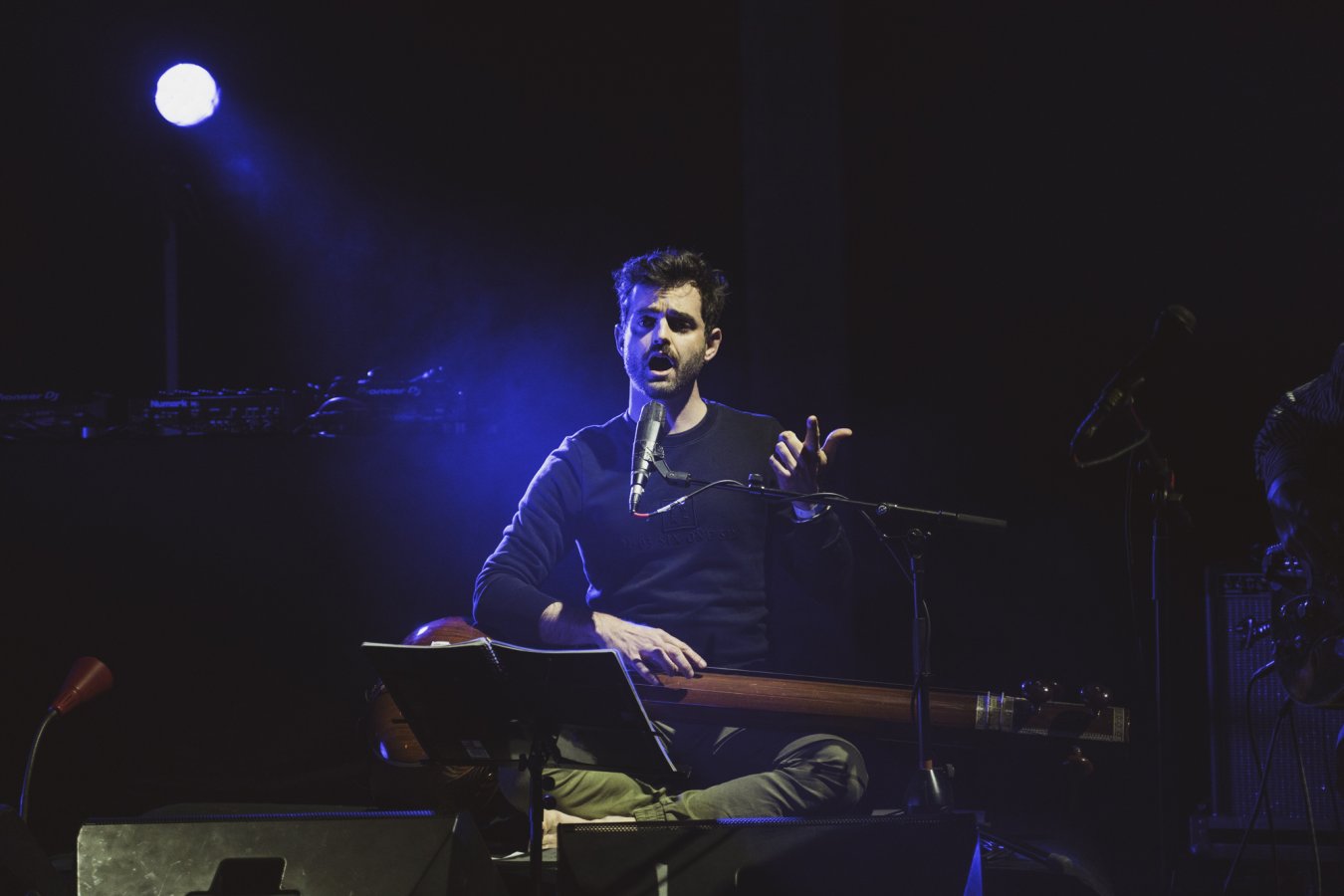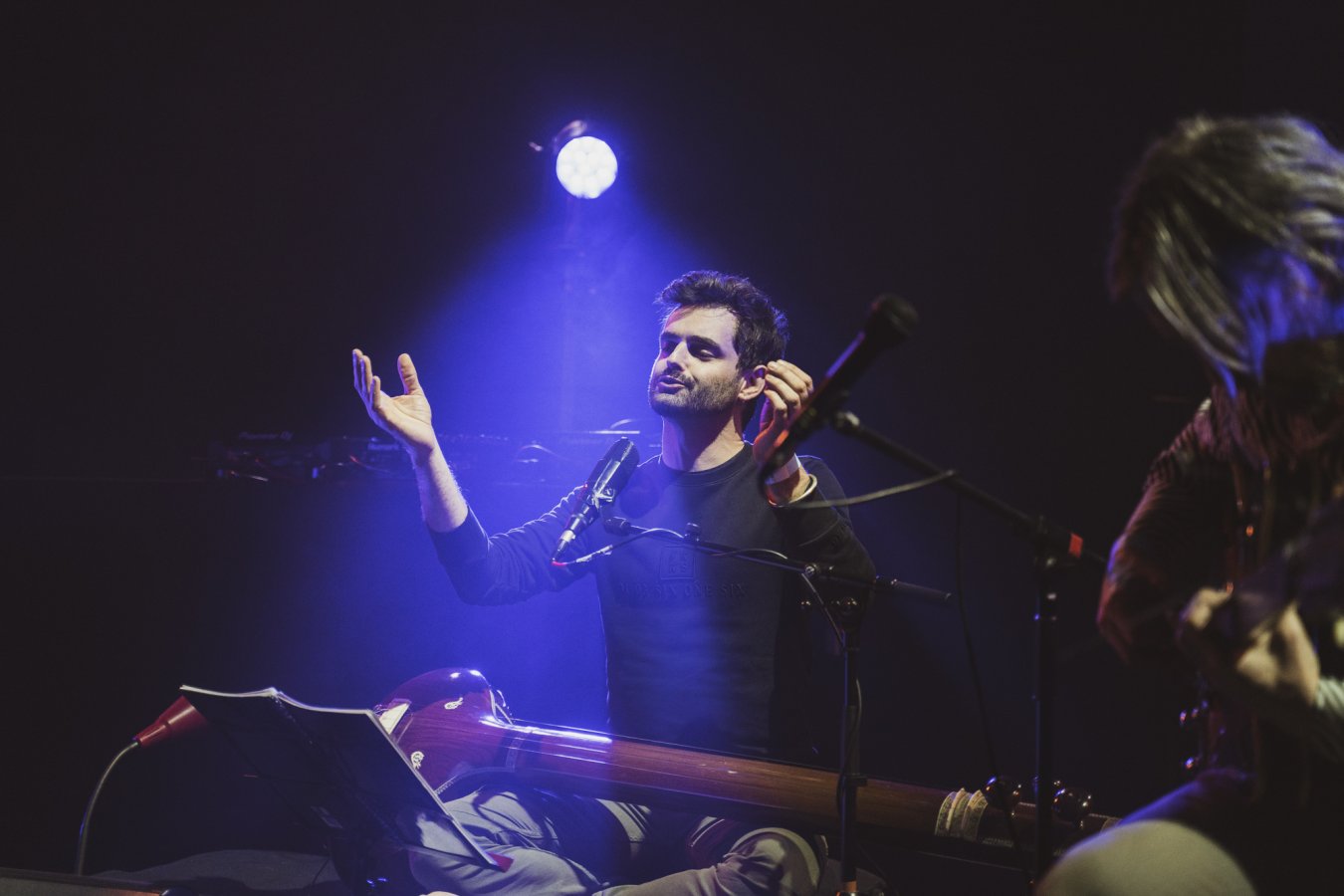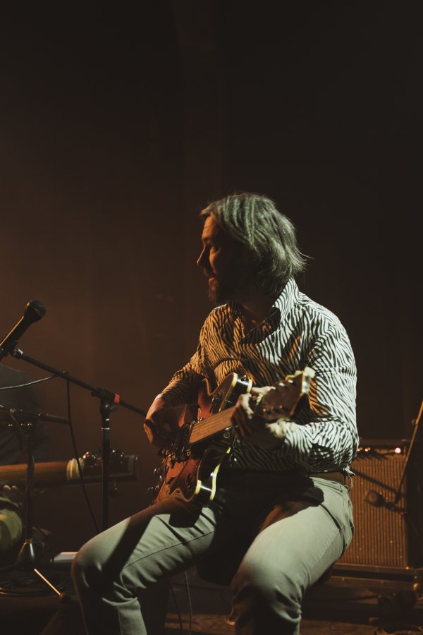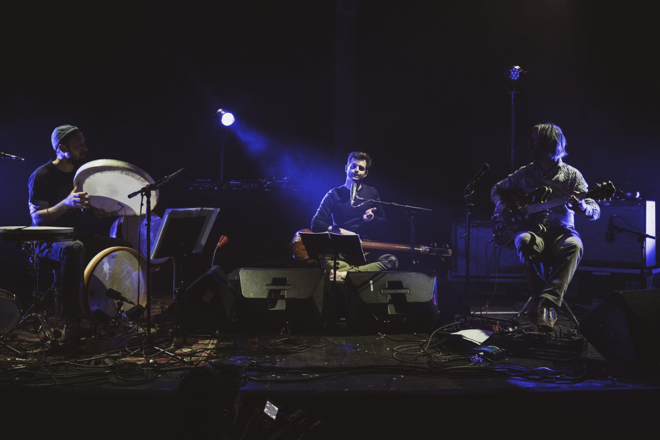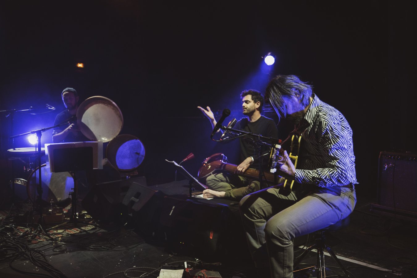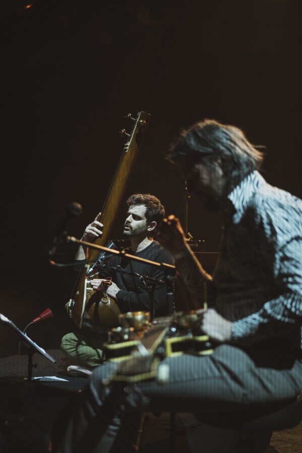 Ce Trio c’est Guilhem Lacroux, guitare électrique défrettée, Thomas Lippens, percussions sur cadre et Clément Gauthier chant, saz, tanpura, porteur du projet. C’est le Trio SERR.