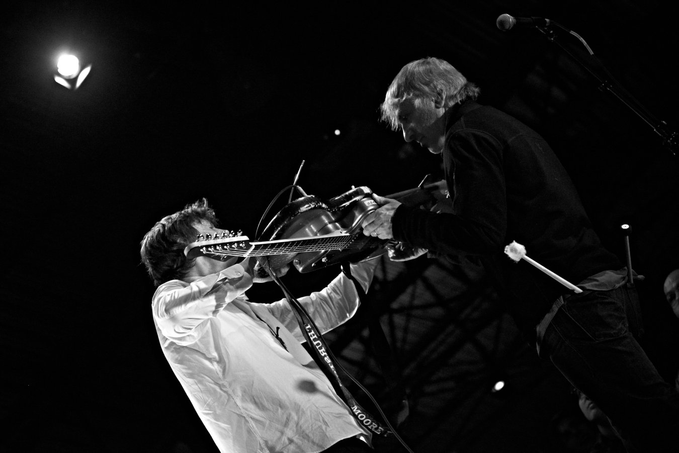 Lee Ranaldo et Thurston Moore à Sonic Protest ! Soit deux des plus aventureux activistes des musiques d'aujourd'hui, de ceux qui créent un style, qui font les liens et suscitent des vocations. Tous deux fondateurs de Sonic Youth, ces têtes chercheuses se sont rencontrées dans l'orchestre de Glenn Branca en pleine explosion No Wave et ont influencé plus d'un auditeur en détruisant méticuleusement la frontière entre pop music et avant-garde. A travers le parcours de Sonic Youth ou de nombre de leurs projets annexes (Chelsea Light Moving ou Text Of Light) et au sein de leurs innombrables collaborations avec des artistes aussi divers et cultes que Christian Marclay, William Hooker, Alan Licht, Truus de Groot, etc. (pour Ranaldo) ou Borbetomagus, Merce Cunningham, Gus Van Sant (pour Moore), leur influence sur la scène internationale des musiques obliques est majeure. Lee Ranaldo et Thurtson Moore sont deux passeurs de musique : par delà les genres, ils montrent que la musique parle d'elle-même. Revendiquant la liberté comme moteur de la création, Moore et Ranaldo n'hésitent pas à faire le grand écart entre chanson et musique contemporaine : ils forment un lien unique entre la structure couplet / refrain et l'improvisation la plus radicale, le réductionnisme et l'attentat sonore, le rock et la noise. De l'approche organique, cinématographique et quasi conceptuelle de Ranaldo à celle plus déglinguée et brutaliste de Moore, la volonté commune reste toujours de tisser des ponts, décloisonner et surtout expérimenter ! Du bruit et de la poésie, de la fureur et de la délicatesse, ensemble ou séparément, Lee Ranaldo et Thurston Moore osent tous les rapprochements depuis près de trente-cinq ans : merci !