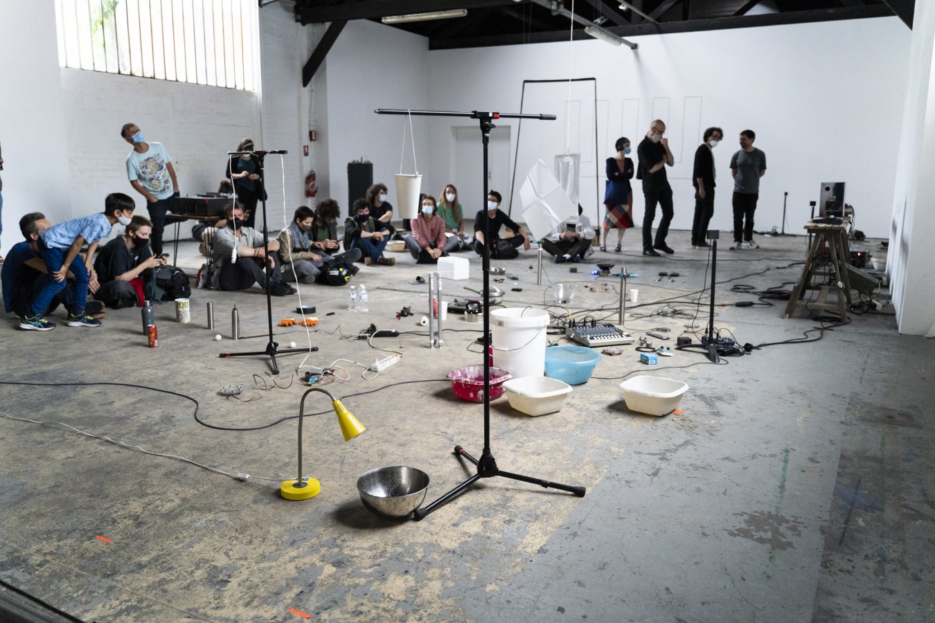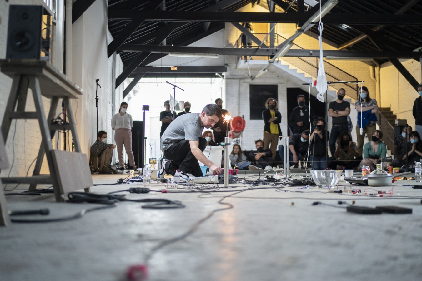 Dans Point of Failure, Tim Shaw, joue avec les caractéristiques acoustiques du lieu de performance au moyen de cônes de haut-parleur, d’ampoules, de pétards, de bobines tesla, de cornes à air, d’éclateurs, d’antennes paraboliques, de boules de fumée, de klaxons de voiture, de gouttes d’eau, d’hydrophones, de shaker, de cloches, de synthétiseurs modulaires, d’instruments à cordes faits maison, de ballons, de transducteurs, de pluie, de ventilateurs, de solénoïdes, de micros contact, de circuits bricolés et de moteurs. En fabriquant et en défaisant des objets, en construisant des mécanismes hybrides pour faire du bruit, en déployant une expérience multisensorielle désordonnée, se crée un environnement hypnotique dans lequel le son, la lumière, la fumée, l’odeur et le mouvement s’entremêlent.